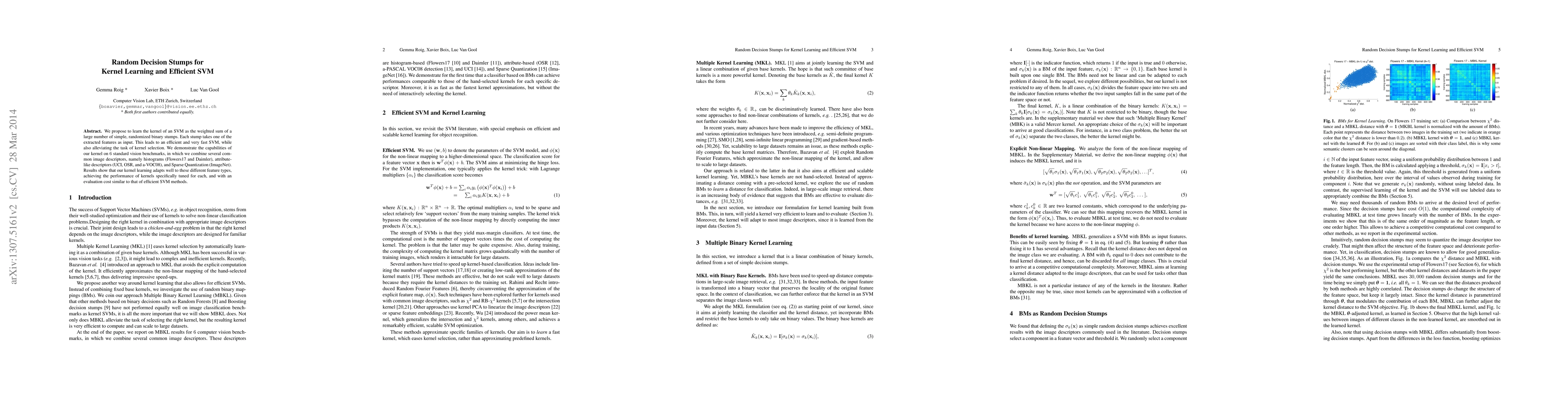 Support Vector Machines (SVMs) are powerful learners that have led to state-of-the-art results in various computer vision problems. SVMs suffer from various drawbacks in terms of selecting the right kernel, which depends on the image descriptors, as well as computational and memory efficiency. This paper introduces a novel kernel, which serves such issues well. The kernel is learned by exploiting a large amount of low-complex, randomized binary mappings of the input feature. This leads to an efficient SVM, while also alleviating the task of kernel selection. We demonstrate the capabilities of our kernel on 6 standard vision benchmarks, in which we combine several common image descriptors, namely histograms (Flowers17 and Daimler), attribute-like descriptors (UCI, OSR, and a-VOC08), and Sparse Quantization (ImageNet). Results show that our kernel learning adapts well to the different descriptors types, achieving the performance of the kernels specifically tuned for each image descriptor, and with similar evaluation cost as efficient SVM methods.