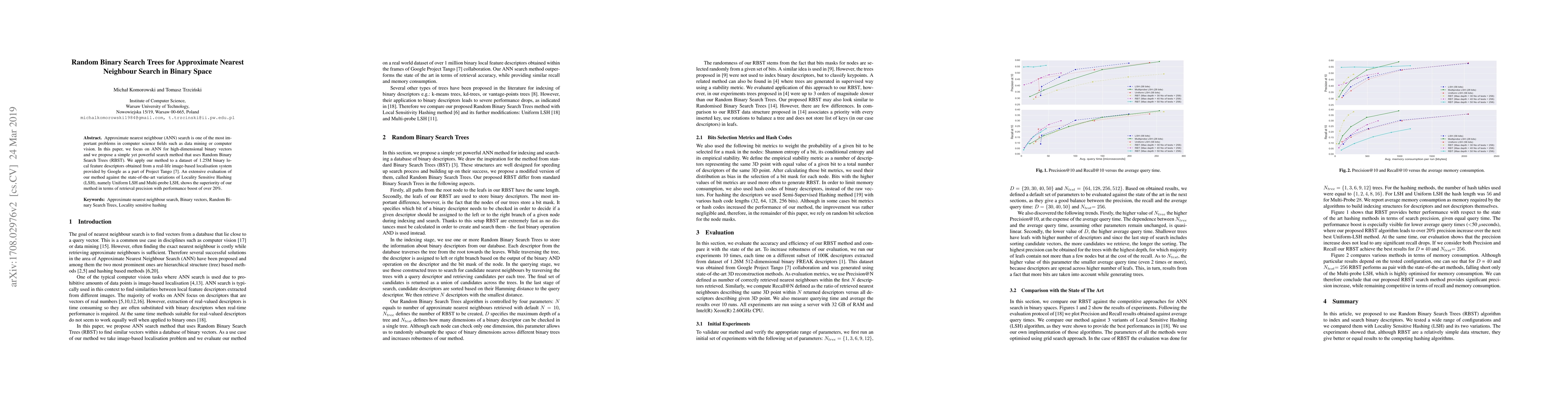 Approximate nearest neighbour (ANN) search is one of the most important problems in computer science fields such as data mining or computer vision. In this paper, we focus on ANN for high-dimensional binary vectors and we propose a simple yet powerful search method that uses Random Binary Search Trees (RBST). We apply our method to a dataset of 1.25M binary local feature descriptors obtained from a real-life image-based localisation system provided by Google as a part of Project Tango. An extensive evaluation of our method against the state-of-the-art variations of Locality Sensitive Hashing (LSH), namely Uniform LSH and Multi-probe LSH, shows the superiority of our method in terms of retrieval precision with performance boost of over 20%