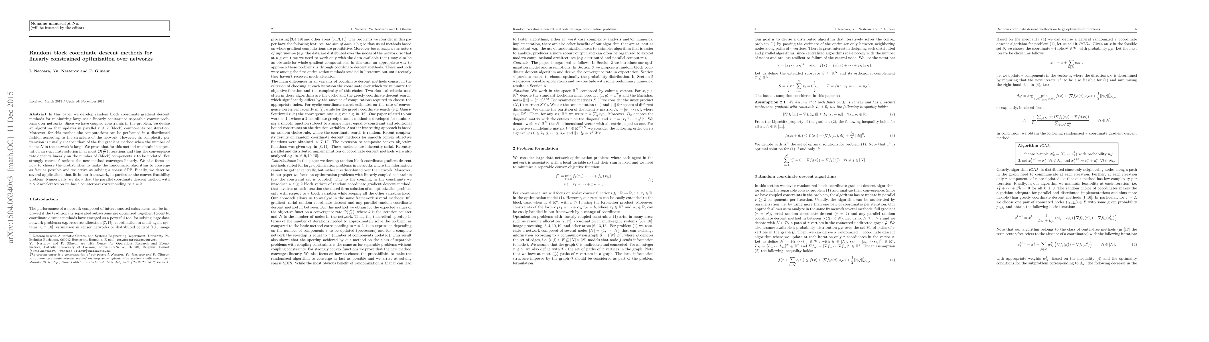 This paper introduces random block coordinate descent methods for solving large-scale linearly constrained convex optimization problems over networks. The proposed algorithm updates multiple (at least two) block components in parallel, enabling distributed computation and faster convergence compared to full gradient methods, especially for large networks.