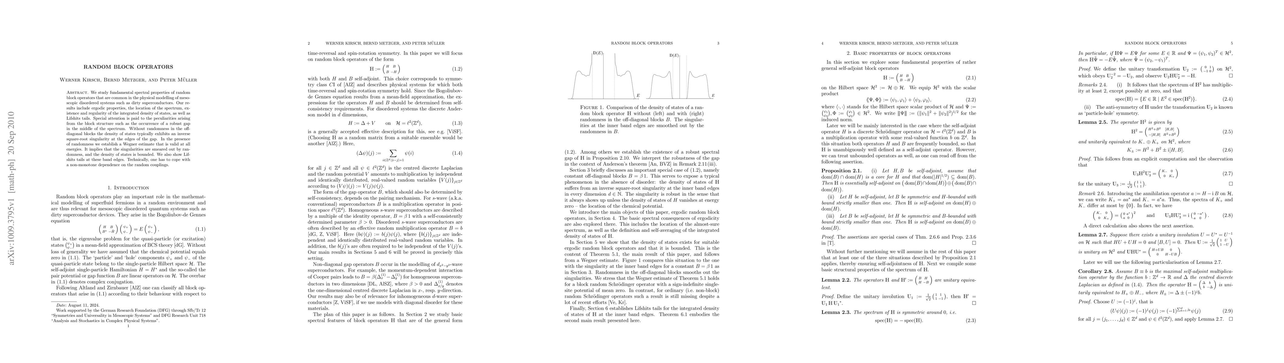 Researchers studied random block operators in disordered systems, finding that randomness smears out singularities and bounds density of states, with a robust gap in the middle of the spectrum.