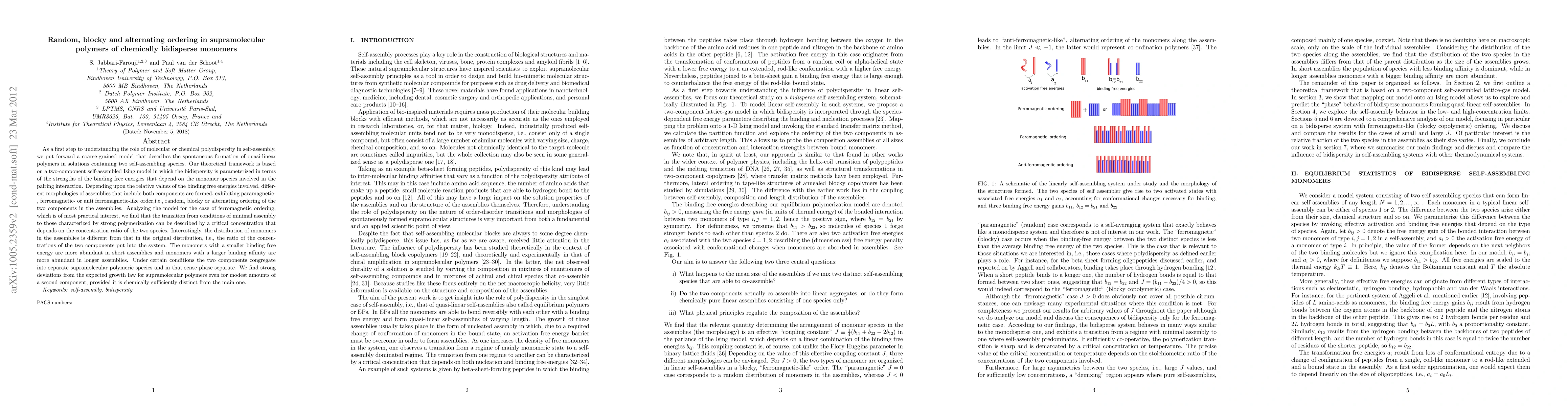 As a first step to understanding the role of molecular or chemical polydispersity in self-assembly, we put forward a coarse-grained model that describes the spontaneous formation of quasi-linear polymers in solutions containing two self-assembling species. Our theoretical framework is based on a two-component self-assembled Ising model in which the bidispersity is parameterized in terms of the strengths of the binding free energies that depend on the monomer species involved in the pairing interaction. Depending upon the relative values of the binding free energies involved, different morphologies of assemblies that include both components are formed, exhibiting paramagnetic-, ferromagnetic- or anti ferromagnetic-like order,i.e., random, blocky or alternating ordering of the two components in the assemblies. Analyzing the model for the case of ferromagnetic ordering, which is of most practical interest, we find that the transition from conditions of minimal assembly to those characterized by strong polymerization can be described by a critical concentration that depends on the concentration ratio of the two species. Interestingly, the distribution of monomers in the assemblies is different from that in the original distribution, i.e., the ratio of the concentrations of the two components put into the system. The monomers with a smaller binding free energy are more abundant in short assemblies and monomers with a larger binding affinity are more abundant in longer assemblies. Under certain conditions the two components congregate into separate supramolecular polymeric species and in that sense phase separate. We find strong deviations from the expected growth law for supramolecular polymers even for modest amounts of a second component, provided it is chemically sufficiently distinct from the main one.