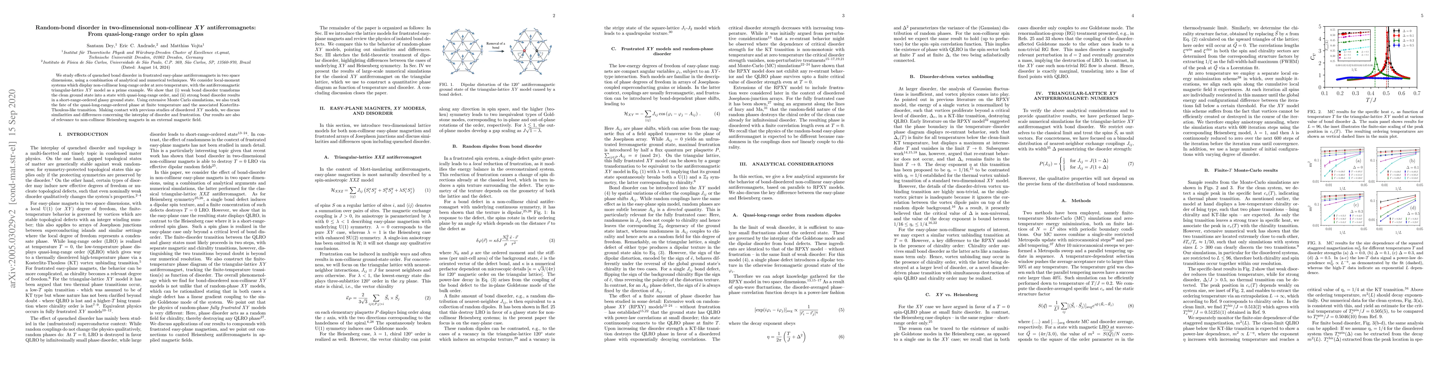 This paper investigates the impact of quenched bond disorder in two-dimensional non-collinear XY antiferromagnets, demonstrating that weak disorder leads to a quasi-long-range order state, while strong disorder induces a spin glass phase. The study combines analytical and numerical methods to explore these transitions and their temperature-dependent behavior.