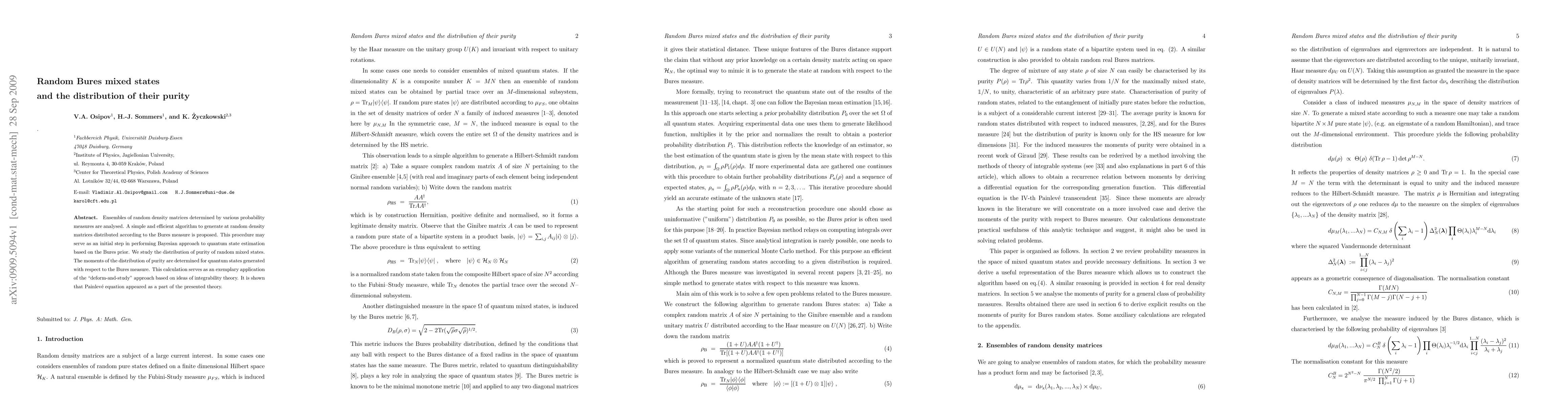 Ensembles of random density matrices determined by various probability measures are analysed. A simple and efficient algorithm to generate at random density matrices distributed according to the Bures measure is proposed. This procedure may serve as an initial step in performing Bayesian approach to quantum state estimation based on the Bures prior. We study the distribution of purity of random mixed states. The moments of the distribution of purity are determined for quantum states generated with respect to the Bures measure. This calculation serves as an exemplary application of the "deform-and-study" approach based on ideas of integrability theory. It is shown that Painlev\'e equation appeared as a part of the presented theory.