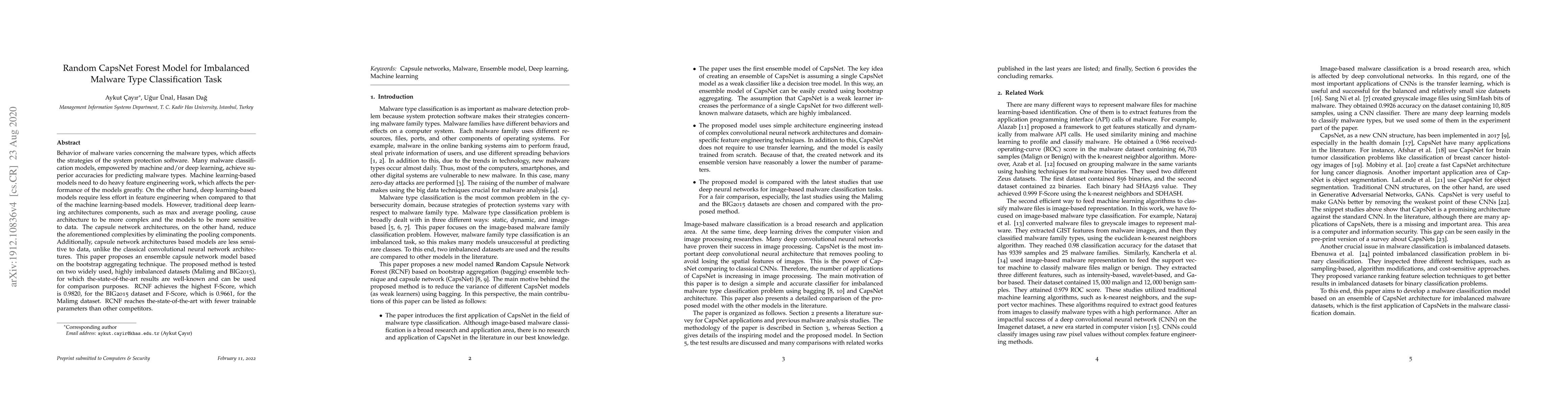 This research introduces a Random CapsNet Forest model for malware type classification, addressing the challenge of imbalanced datasets. The model, based on Capsule Networks and bootstrap aggregating, reduces complexity and data sensitivity compared to traditional deep learning architectures, achieving high accuracy on standard malware datasets.