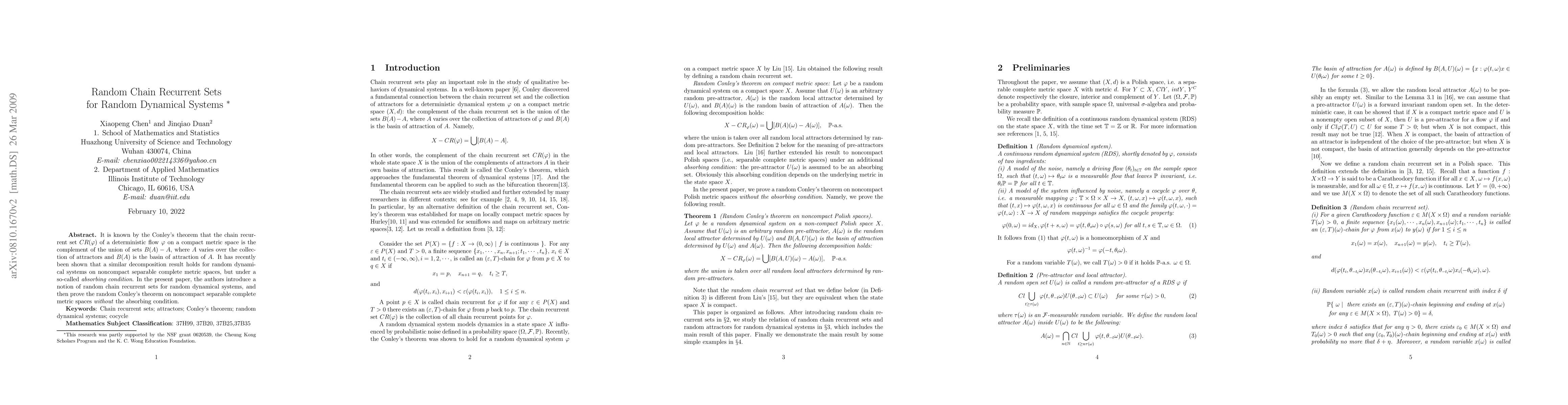 Researchers prove a Conley's theorem for random dynamical systems on noncompact separable complete metric spaces without an absorbing condition, introducing the concept of random chain recurrent sets.
