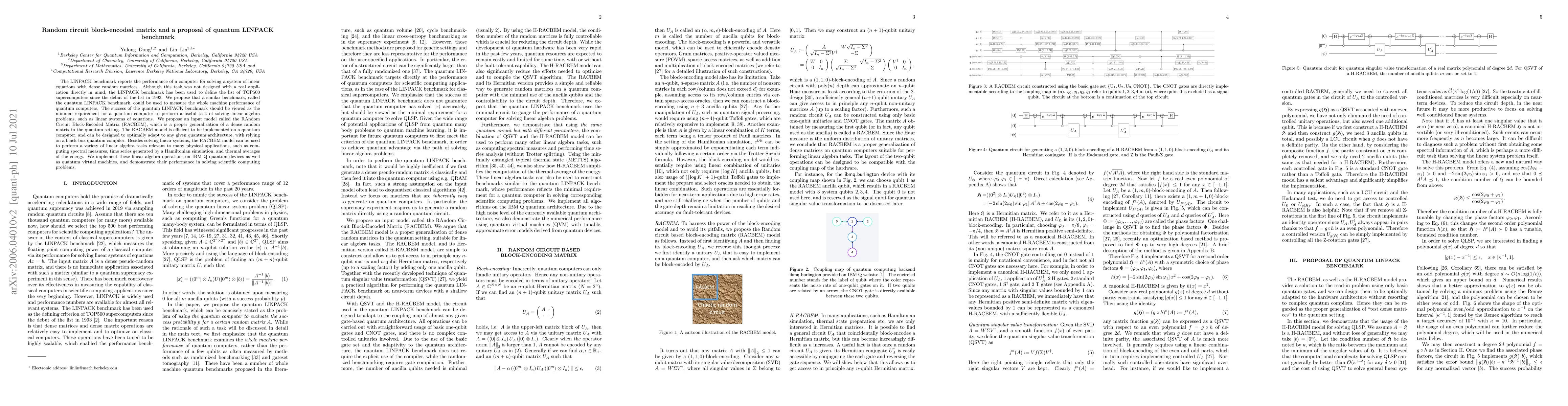 The paper proposes a quantum LINPACK benchmark to measure quantum computer performance, suggesting the RAndom Circuit Block-Encoded Matrix (RACBEM) model for efficient implementation on quantum devices. The RACBEM model can perform various linear algebra tasks and is demonstrated on IBM Q quantum devices and virtual machines.