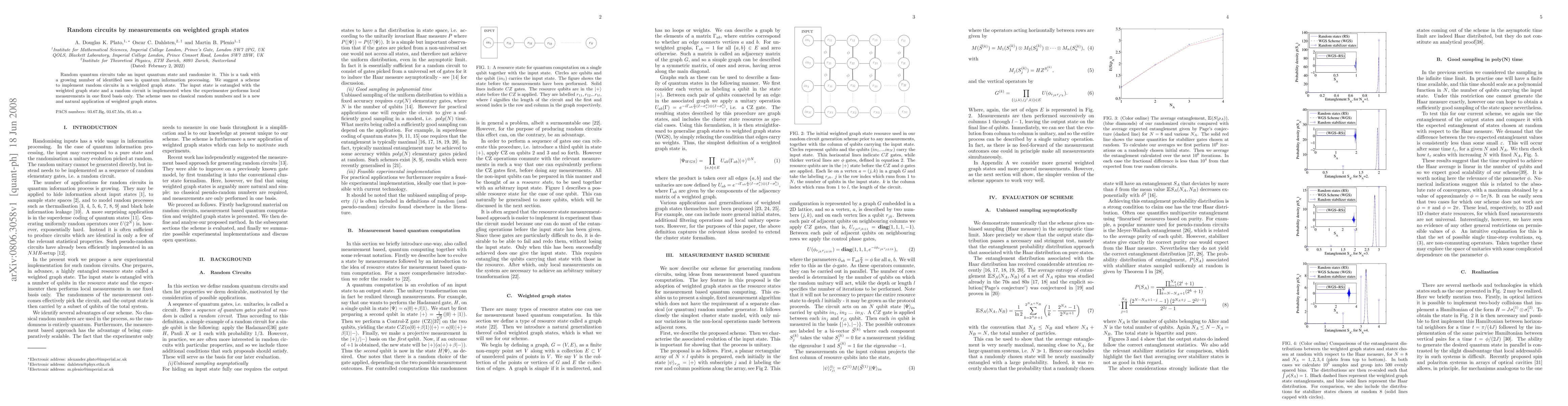 Random quantum circuits take an input quantum state and randomize it. This is a task with a growing number of identified uses in quantum information processing. We suggest a scheme to implement random circuits in a weighted graph state. The input state is entangled with the weighted graph state and a random circuit is implemented when the experimenter performs local measurements in one fixed basis only. The scheme uses no classical random numbers and is a new and natural application of weighted graph states