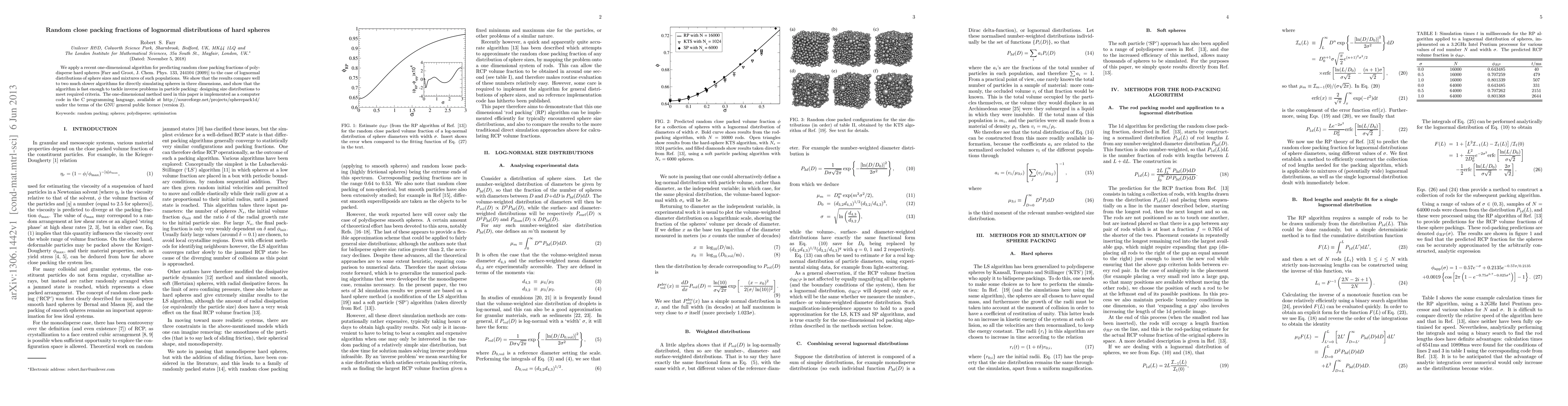 This paper applies a one-dimensional algorithm to predict the random close packing fractions of lognormal distributions of polydisperse hard spheres, demonstrating its efficiency compared to three-dimensional simulations. The algorithm is fast enough for inverse problems in particle packing design.