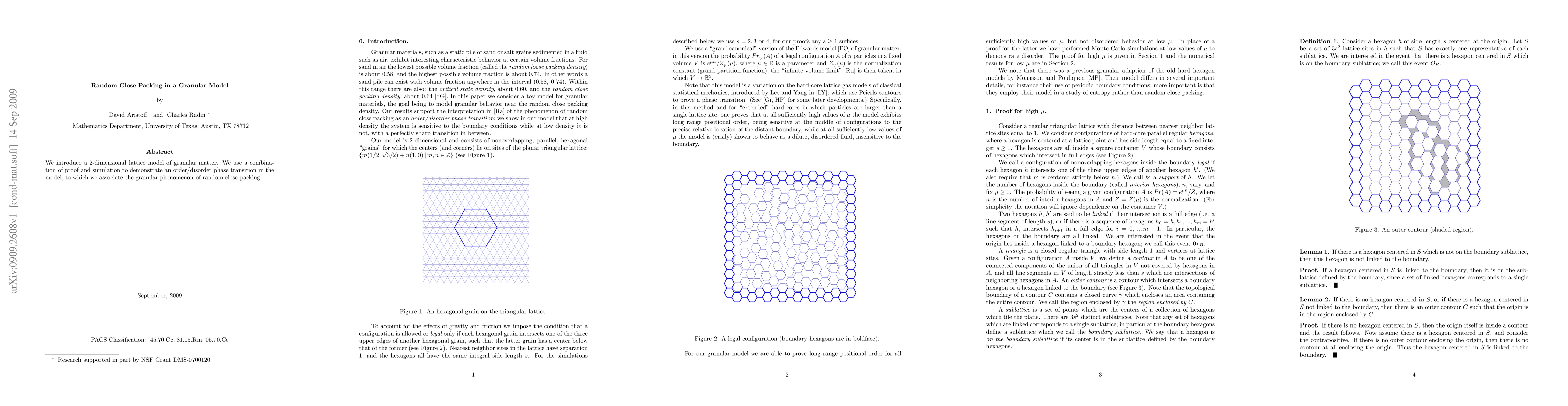 We introduce a 2-dimensional lattice model of granular matter. We use a combination of proof and simulation to demonstrate an order/disorder phase transition in the model, to which we associate the granular phenomenon of random close packing.