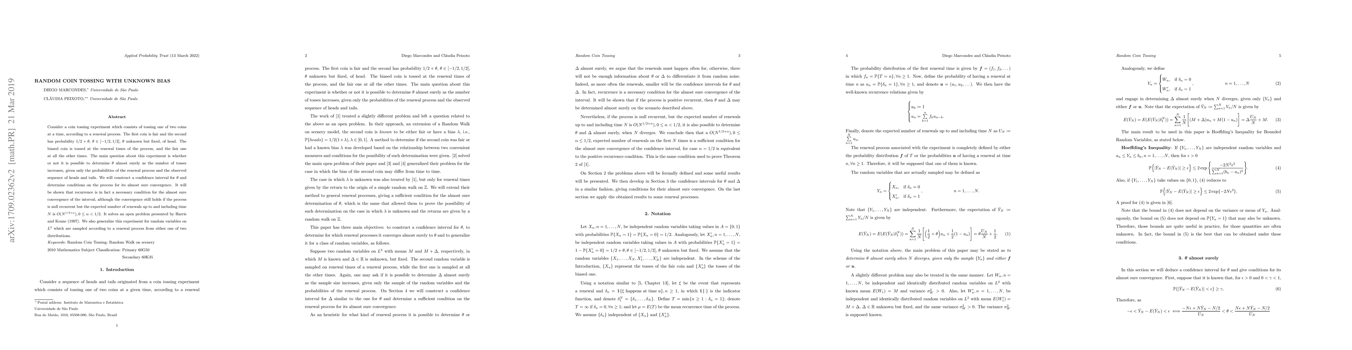Consider a coin tossing experiment which consists of tossing one of two coins at a time, according to a renewal process. The first coin is fair and the second has probability $1/2 + \theta$, $\theta \in [-1/2,1/2]$, $\theta$ unknown but fixed, of head. The biased coin is tossed at the renewal times of the process, and the fair one at all the other times. The main question about this experiment is whether or not it is possible to determine $\theta$ almost surely as the number of tosses increases, given only the probabilities of the renewal process and the observed sequence of heads and tails. We will construct a confidence interval for $\theta$ and determine conditions on the process for its almost sure convergence. It will be shown that recurrence is in fact a necessary condition for the almost sure convergence of the interval, although the convergence still holds if the process is null recurrent but the expected number of renewals up to and including time $N$ is $O(N^{1/2+\alpha}), 0 \leq \alpha < 1/2$. It solves an open problem presented by Harris and Keane (1997). We also generalize this experiment for random variables on $L^{2}$ which are sampled according to a renewal process from either one of two distributions.