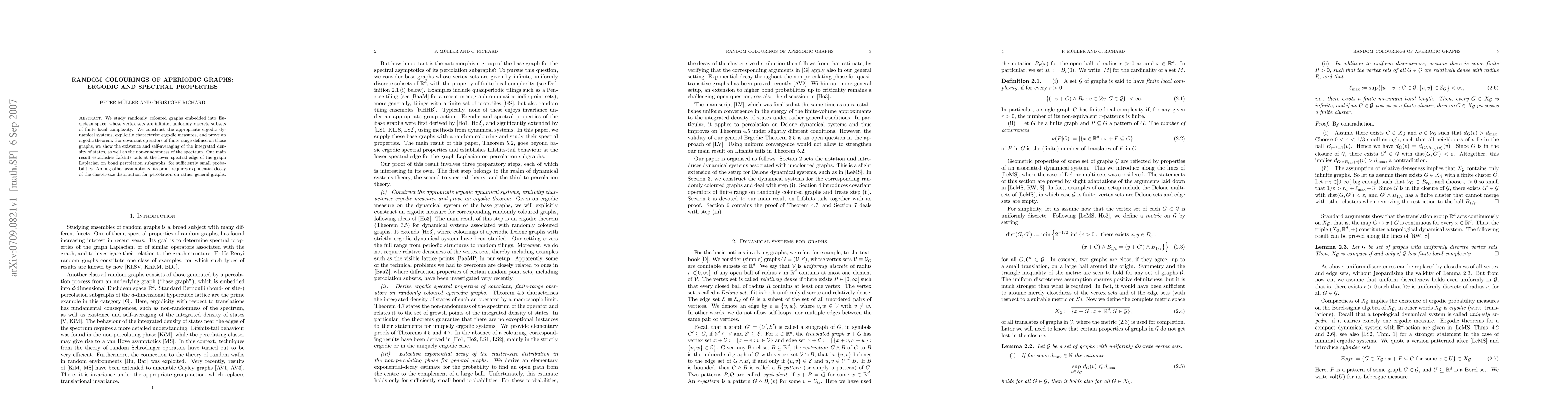 This paper explores randomly coloured aperiodic graphs with finite local complexity, constructing ergodic dynamical systems and proving an ergodic theorem. It demonstrates the existence and self-averaging of the integrated density of states and non-randomness of the spectrum for covariant operators, concluding with Lifshitz tails at the lower spectral edge of the graph Laplacian under bond percolation subgraphs.