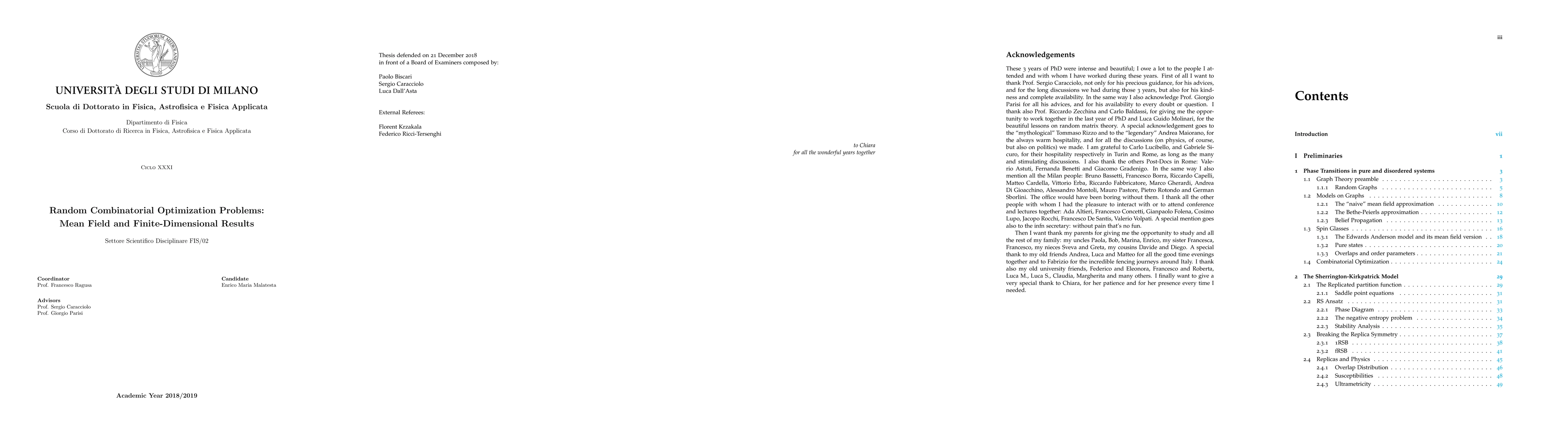 This PhD thesis is organized as follows. In the first two chapters I will review some basic notions of statistical physics of disordered systems, such as random graph theory, the mean-field approximation, spin glasses and combinatorial optimization. The replica method will also be introduced and applied to the Sherrington-Kirkpatrick model, one of the simplest mean-field models of spin-glasses. The second part of the thesis deals with mean-field combinatorial optimization problems. The attention will be focused on the study of finite-size corrections of random integer matching problems (chapter 3) and fractional ones (chapter 4). In chapter 5 I will discuss a very general relation connecting multi-overlaps and the moments of the cavity magnetization distribution. In the third part we consider random Euclidean optimization problems. I will start solving the traveling-salesman-problem (TSP) in one dimension both in its bipartite and monopartite version (chapter 6). In chapter 7 I will discuss the possible optimal solutions of the 2-factor problem. In chapter 8 I will solve the bipartite TSP in two dimensions, in the limit of large number of points. Chapter 9 contains some conclusions.