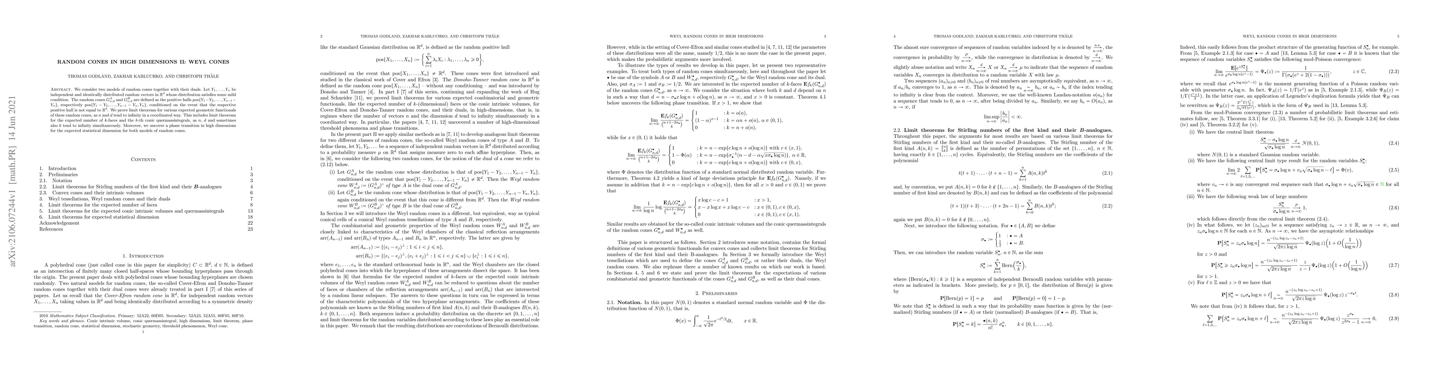This research paper studies random cones in high dimensions and proves limit theorems for various geometric functionals as n and d tend to infinity, uncovering a phase transition in high dimensions.