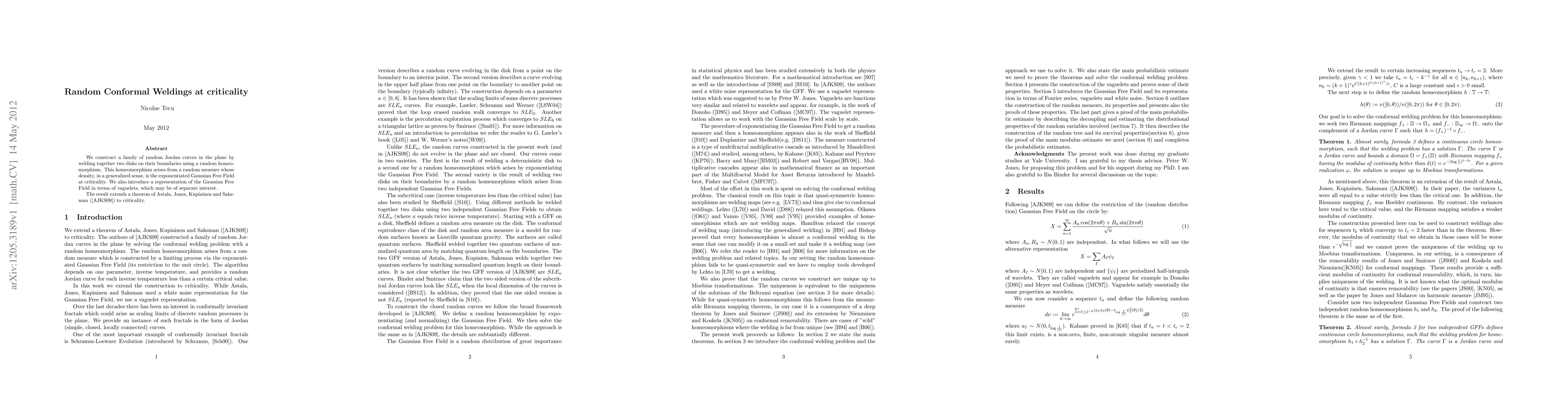 We construct a family of random Jordan curves in the plane by welding together two disks on their boundaries using a random homeomorphism. This homeomorphism arises from a random measure whose density, in a generalized sense, is the exponentiated Gaussian Free Field at criticality. We also introduce a representation of the Gaussian Free Field in terms of vaguelets, which may be of separate interest. The result extends a theorem of Astala, Jones, Kupiainen and Saksman (\cite{AJKS09}) to criticality.