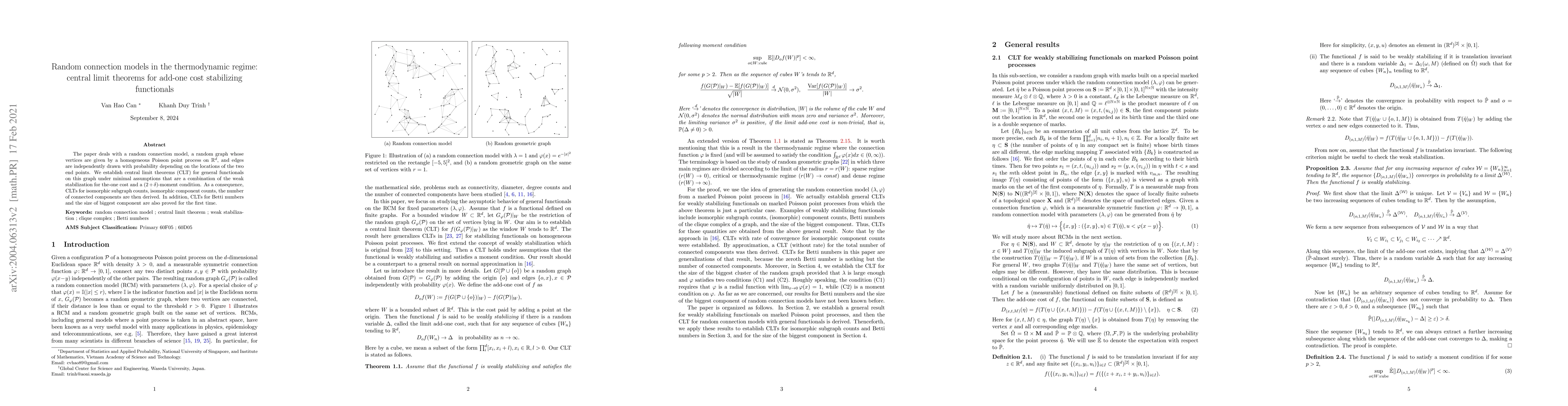 The paper deals with a random connection model, a random graph whose vertices are given by a homogeneous Poisson point process on $\mathbb{R}^d$, and edges are independently drawn with probability depending on the locations of the two end points. We establish central limit theorems (CLT) for general functionals on this graph under minimal assumptions that are a combination of the weak stabilization for the-one cost and a $(2+\delta)$-moment condition. As a consequence, CLTs for isomorphic subgraph counts, isomorphic component counts, the number of connected components are then derived. In addition, CLTs for Betti numbers and the size of biggest component are also proved for the first time.