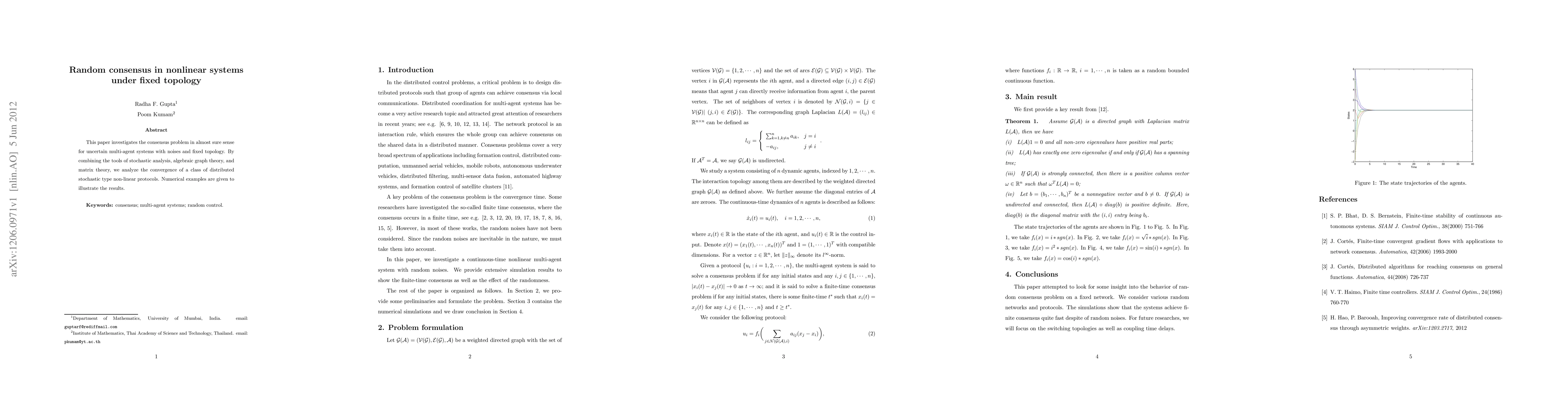 This paper explores the consensus problem in uncertain multi-agent systems with noise and fixed topology, analyzing the convergence of distributed stochastic nonlinear protocols using stochastic analysis, algebraic graph theory, and matrix theory. Numerical examples demonstrate the theoretical findings.