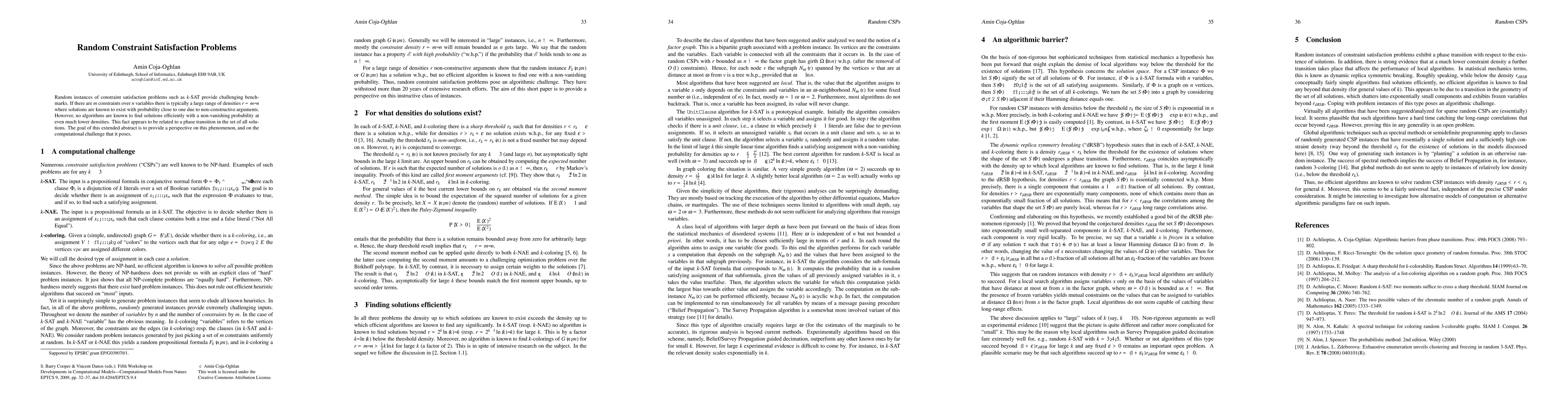 This paper explores the computational difficulty of solving random constraint satisfaction problems like k-SAT, highlighting the phase transition where solutions exist with high probability but efficient algorithms fail to find them, posing a significant computational challenge.