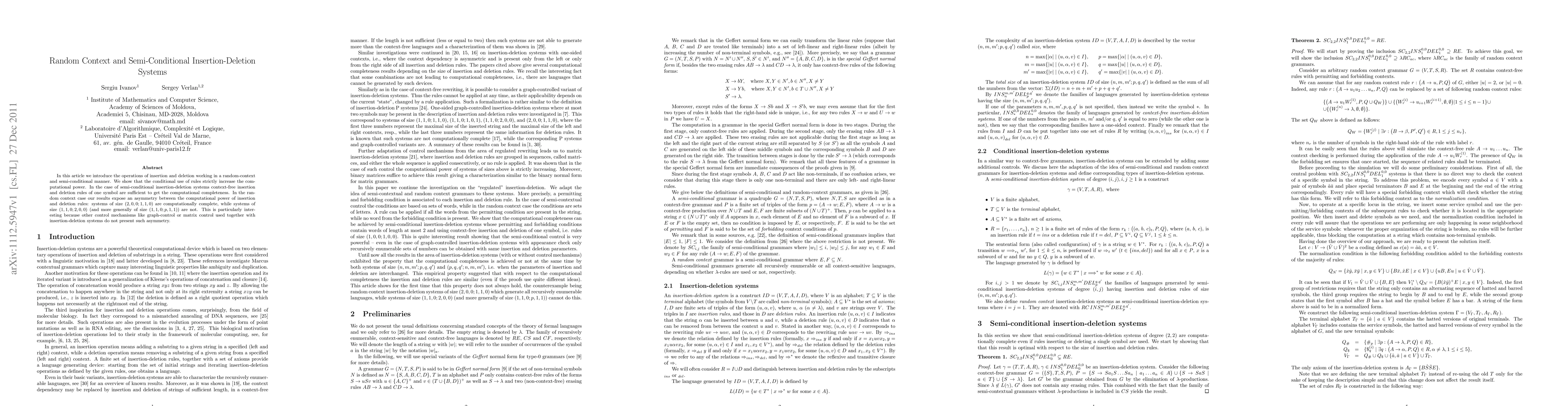 This paper explores random-context and semi-conditional insertion-deletion systems, demonstrating that semi-conditional rules enhance computational power, achieving completeness with context-free rules. It reveals an asymmetry in random-context systems where insertion-only systems are complete, unlike deletion-only systems, a distinction not seen with other control mechanisms.