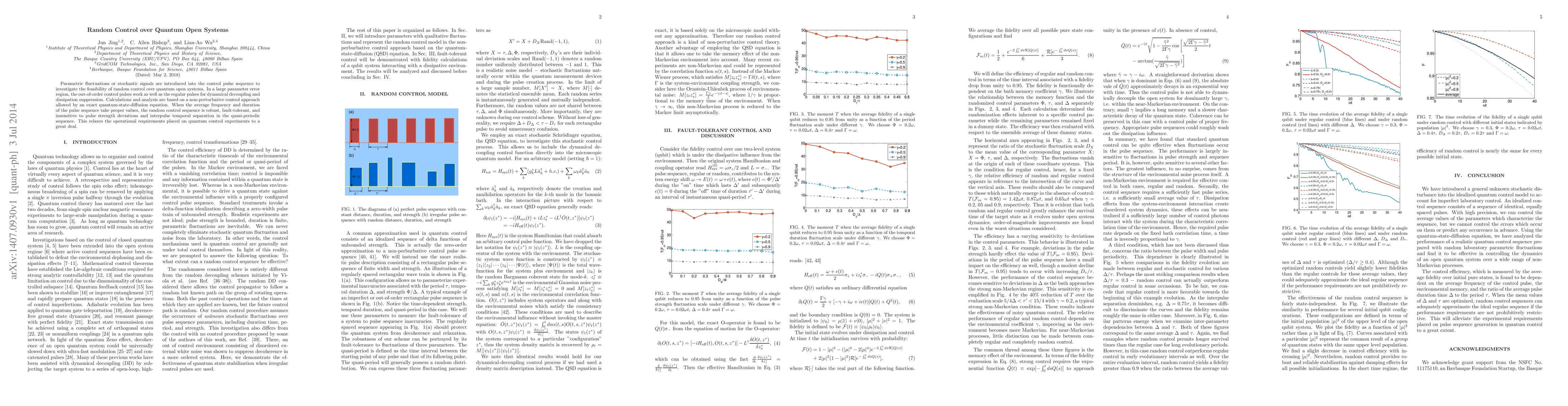 Parametric fluctuations or stochastic signals are introduced into the control pulse sequence to investigate the feasibility of random control over quantum open systems. In a large parameter error region, the out-of-order control pulses work as well as the regular pulses for dynamical decoupling and dissipation suppression. Calculations and analysis are based on a non-perturbative control approach allowed by an exact quantum-state-diffusion equation. When the average frequency and duration of the pulse sequence take proper values, the random control sequence is robust, fault- tolerant, and insensitive to pulse strength deviations and interpulse temporal separation in the quasi-periodic sequence. This relaxes the operational requirements placed on quantum control experiments to a great deal.