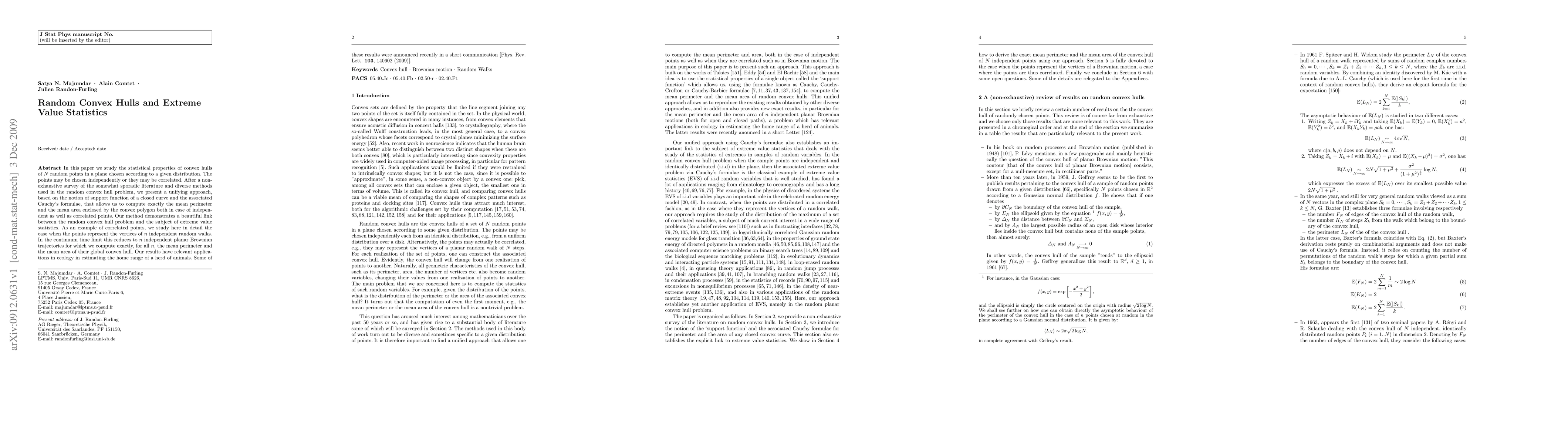 In this paper we study the statistical properties of convex hulls of $N$ random points in a plane chosen according to a given distribution. The points may be chosen independently or they may be correlated. After a non-exhaustive survey of the somewhat sporadic literature and diverse methods used in the random convex hull problem, we present a unifying approach, based on the notion of support function of a closed curve and the associated Cauchy's formulae, that allows us to compute exactly the mean perimeter and the mean area enclosed by the convex polygon both in case of independent as well as correlated points. Our method demonstrates a beautiful link between the random convex hull problem and the subject of extreme value statistics. As an example of correlated points, we study here in detail the case when the points represent the vertices of $n$ independent random walks. In the continuum time limit this reduces to $n$ independent planar Brownian trajectories for which we compute exactly, for all $n$, the mean perimeter and the mean area of their global convex hull. Our results have relevant applications in ecology in estimating the home range of a herd of animals. Some of these results were announced recently in a short communication [Phys. Rev. Lett. {\bf 103}, 140602 (2009)].