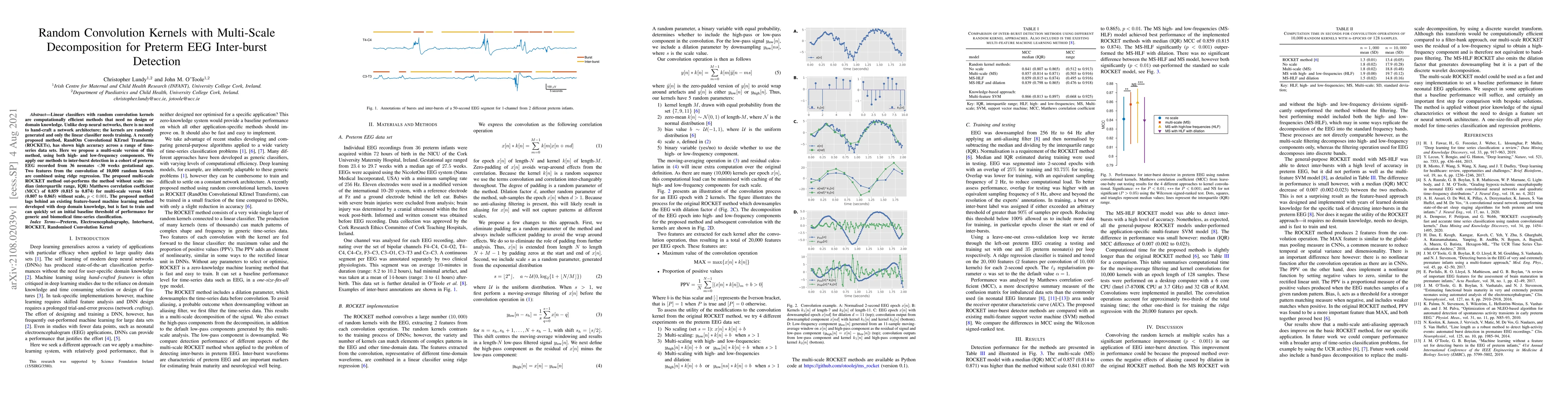 Linear classifiers with random convolution kernels are computationally efficient methods that need no design or domain knowledge. Unlike deep neural networks, there is no need to hand-craft a network architecture; the kernels are randomly generated and only the linear classifier needs training. A recently proposed method, RandOm Convolutional KErnel Transforms (ROCKETs), has shown high accuracy across a range of time-series data sets. Here we propose a multi-scale version of this method, using both high- and low-frequency components. We apply our methods to inter-burst detection in a cohort of preterm EEG recorded from 36 neonates <30 weeks gestational age. Two features from the convolution of 10,000 random kernels are combined using ridge regression. The proposed multi-scale ROCKET method out-performs the method without scale: median (interquartile range, IQR) Matthews correlation coefficient (MCC) of 0.859 (0.815 to 0.874) for multi-scale versus 0.841 (0.807 to 0.865) without scale, p<0.001. The proposed method lags behind an existing feature-based machine learning method developed with deep domain knowledge, but is fast to train and can quickly set an initial baseline threshold of performance for generic and biomedical time-series classification.