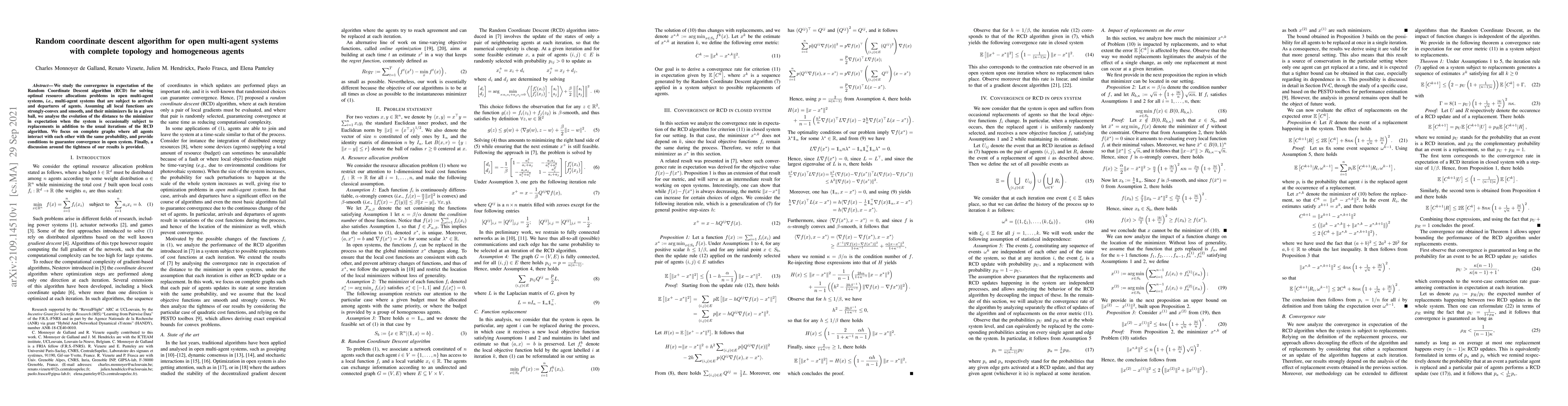 This paper investigates the convergence in expectation of the Random Coordinate Descent algorithm for optimal resource allocation in open multi-agent systems with complete topology. It provides conditions for convergence under occasional agent replacements and analyzes the algorithm's performance in such dynamic environments.
