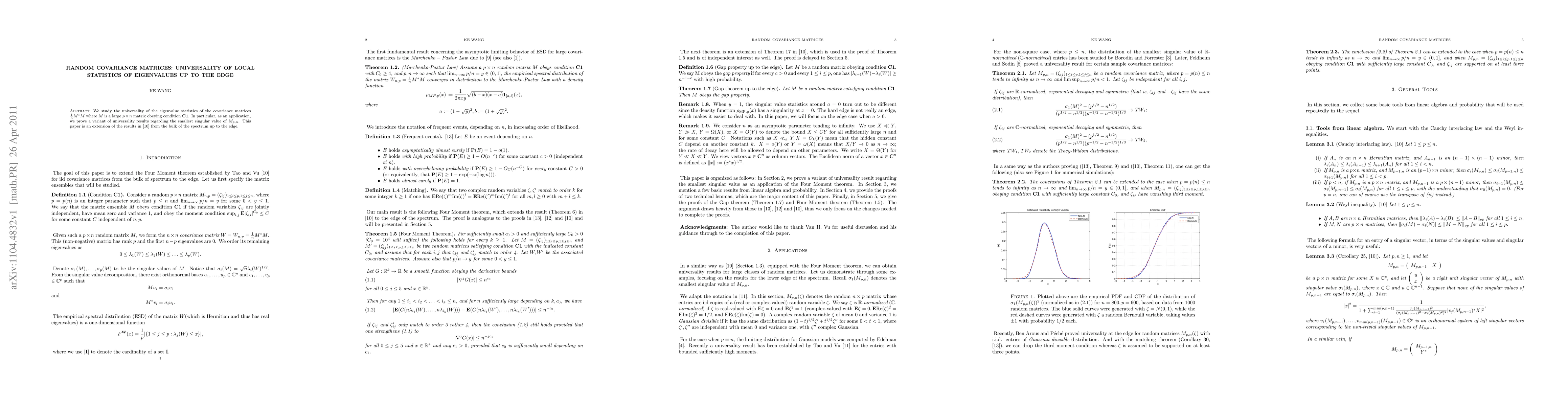 This paper extends previous results on eigenvalue statistics for large random covariance matrices, showing universality of local statistics up to the edge of the spectrum and proving new universality results for the smallest singular value of matrices $M_{p,n}$.
