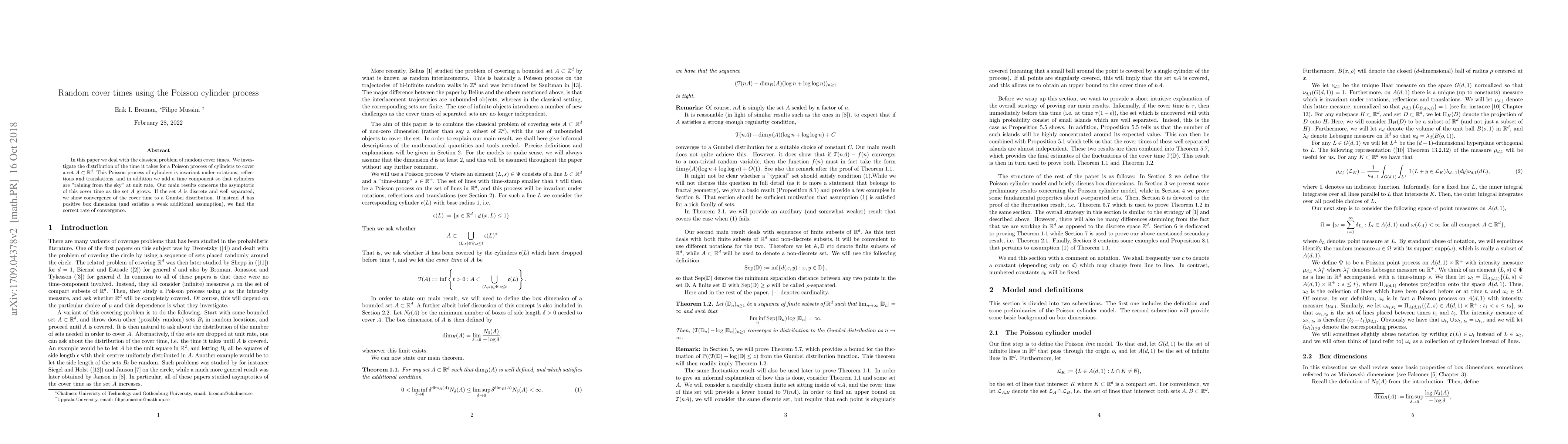This research explores the cover time of a Poisson process of cylinders in mathbb{R}^d, demonstrating that for discrete, well-separated sets, the cover time converges to a Gumbel distribution. For sets with positive box dimension, it identifies the correct rate of convergence.