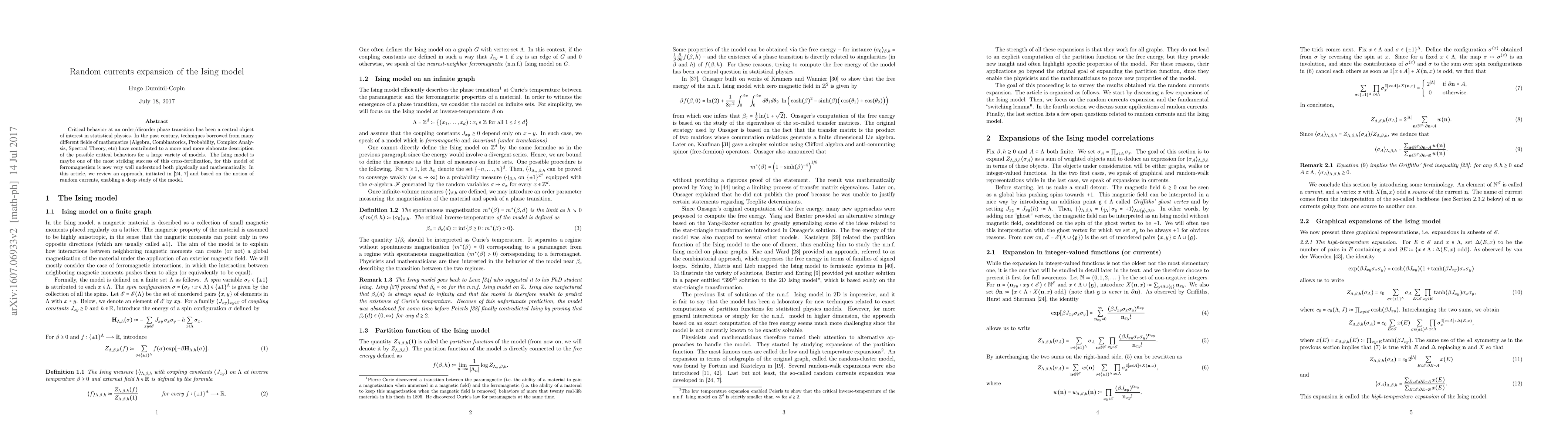 Critical behavior at an order/disorder phase transition has been a central object of interest in statistical physics. In the past century, techniques borrowed from many different fields of mathematics (Algebra, Combinatorics, Probability, Complex Analysis, Spectral Theory, etc) have contributed to a more and more elaborate description of the possible critical behaviors for a large variety of models. The Ising model is maybe one of the most striking success of this cross-fertilization, for this model of ferromagnetism is now very well understood both physically and mathematically. In this article, we review an approach, initiated in \cite{GriHurShe70,Aiz82} and based on the notion of random currents, enabling a deep study of the model.