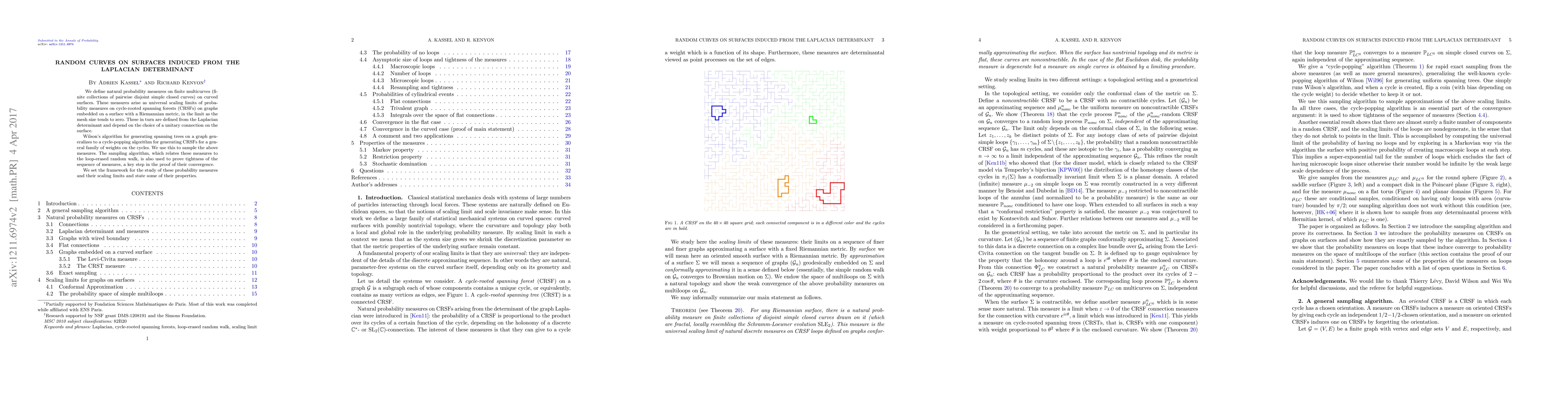 We define natural probability measures on cycle-rooted spanning forests (CRSFs) on graphs embedded on a surface with a Riemannian metric. These measures arise from the Laplacian determinant and depend on the choice of a unitary connection on the tangent bundle to the surface. We show that, for a sequence of graphs $(G_n)$ conformally approximating the surface, the measures on CRSFs of $G_n$ converge and give a limiting probability measure on finite multicurves (finite collections of pairwise disjoint simple closed curves) on the surface, independent of the approximating sequence. Wilson's algorithm for generating spanning trees on a graph generalizes to a cycle-popping algorithm for generating CRSFs for a general family of weights on the cycles. We use this to sample the above measures. The sampling algorithm, which relates these measures to the loop-erased random walk, is also used to prove tightness of the sequence of measures, a key step in the proof of their convergence. We set the framework for the study of these probability measures and their scaling limits and state some of their properties.