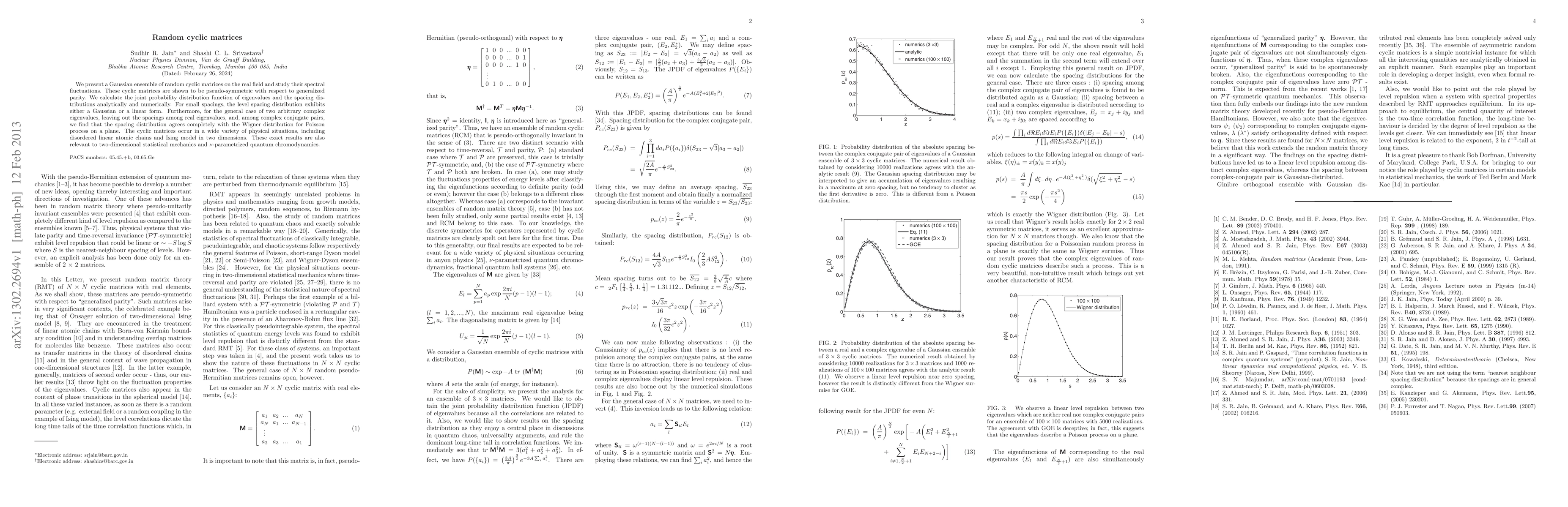 We present a Gaussian ensemble of random cyclic matrices on the real field and study their spectral fluctuations. These cyclic matrices are shown to be pseudo-symmetric with respect to generalized parity. We calculate the joint probability distribution function of eigenvalues and the spacing distributions analytically and numerically. For small spacings, the level spacing distribution exhibits either a Gaussian or a linear form. Furthermore, for the general case of two arbitrary complex eigenvalues, leaving out the spacings among real eigenvalues, and, among complex conjugate pairs, we find that the spacing distribution agrees completely with the Wigner distribution for Poisson process on a plane. The cyclic matrices occur in a wide variety of physical situations, including disordered linear atomic chains and Ising model in two dimensions. These exact results are also relevant to two-dimensional statistical mechanics and $\nu$-parametrized quantum chromodynamics.