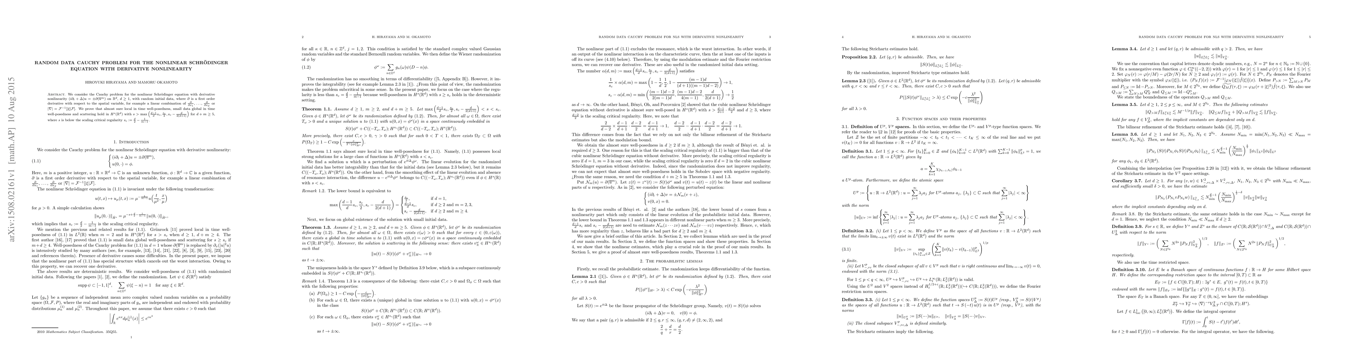 This paper investigates the Cauchy problem for a nonlinear Schrödinger equation with derivative nonlinearity and random initial data. It proves almost sure local well-posedness, small data global well-posedness, and scattering in the Sobolev space $H^s(\R^d)$ under specific conditions on the spatial dimension $d$ and nonlinearity exponent $m$.