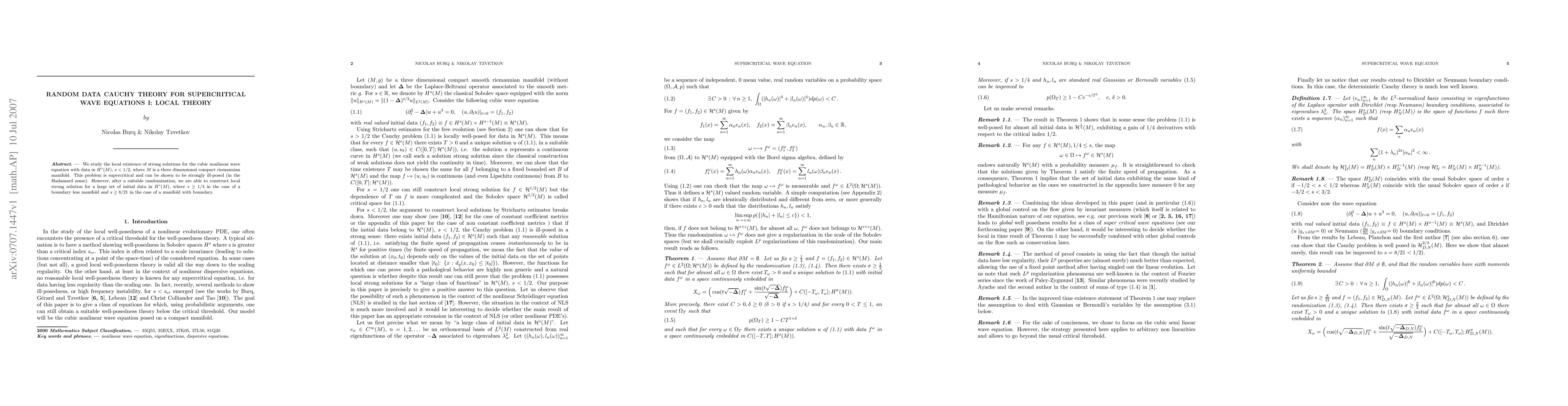 We study the local existence of strong solutions for the cubic nonlinear wave equation with data in $H^s(M)$, $s<1/2$, where $M$ is a three dimensional compact riemannian manifold. This problem is supercritical and can be shown to be strongly ill-posed (in the Hadamard sense). However, after a suitable randomization, we are able to construct local strong solution for a large set of initial data in $H^s(M)$, where $s\geq 1/4$ in the case of a boundary less manifold and $s\geq 8/21$ in the case of a manifold with boundary.