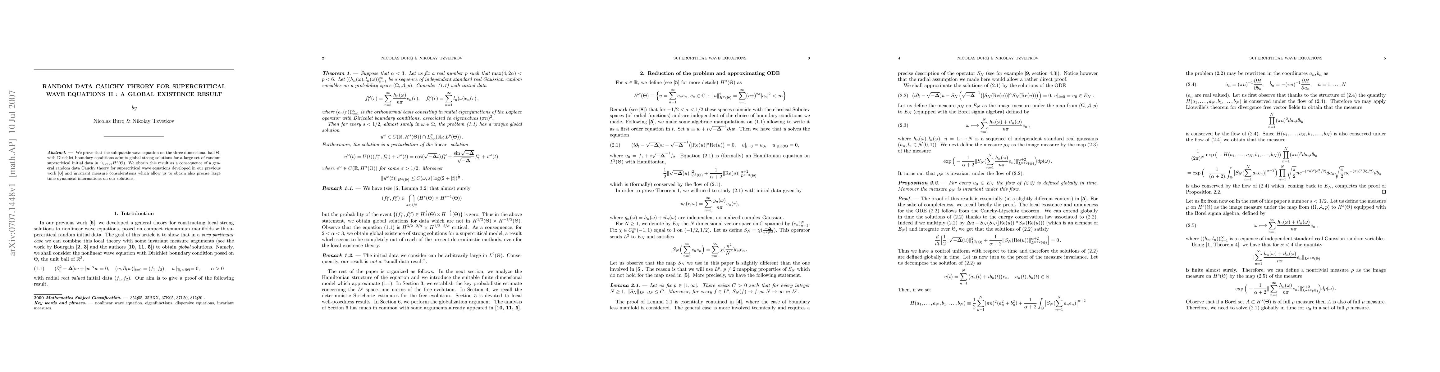 We prove that the subquartic wave equation on the three dimensional ball $\Theta$, with Dirichlet boundary conditions admits global strong solutions for a large set of random supercritical initial data in $\cap_{s<1/2} H^s(\Theta)$. We obtain this result as a consequence of a general random data Cauchy theory for supercritical wave equations developed in our previous work \cite{BT2} and invariant measure considerations which allow us to obtain also precise large time dynamical informations on our solutions.