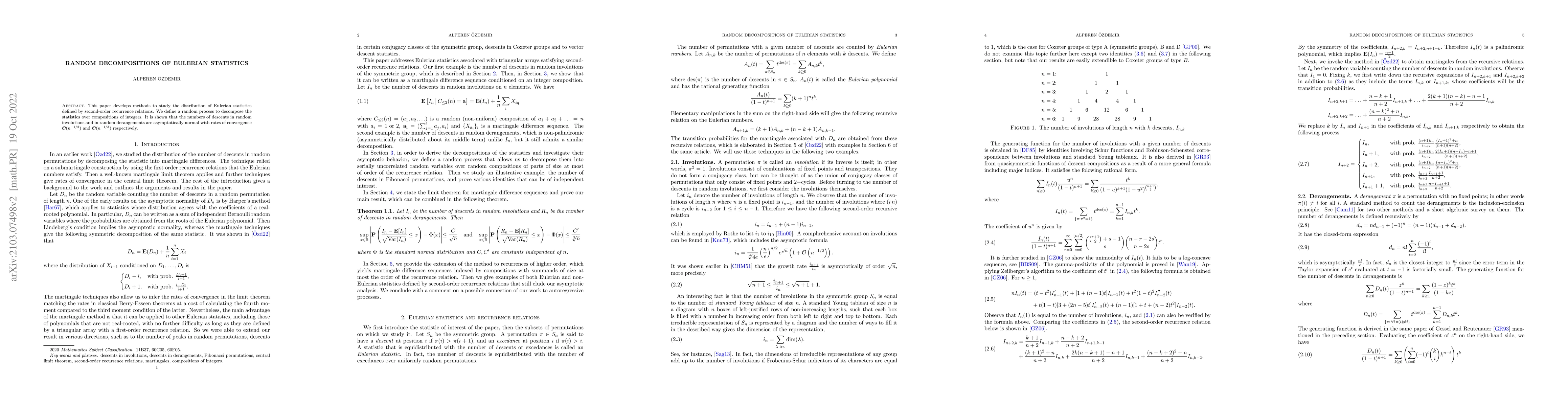 This paper develops methods to study the distribution of Eulerian statistics defined by second-order recurrence relations. We define a random process to decompose the statistics over compositions of integers. It is shown that the numbers of descents in random involutions and in random derangements are asymptotically normal with rates of convergence $\mathcal{O}(n^{-1/2})$ and $\mathcal{O}(n^{-1/3})$ respectively.