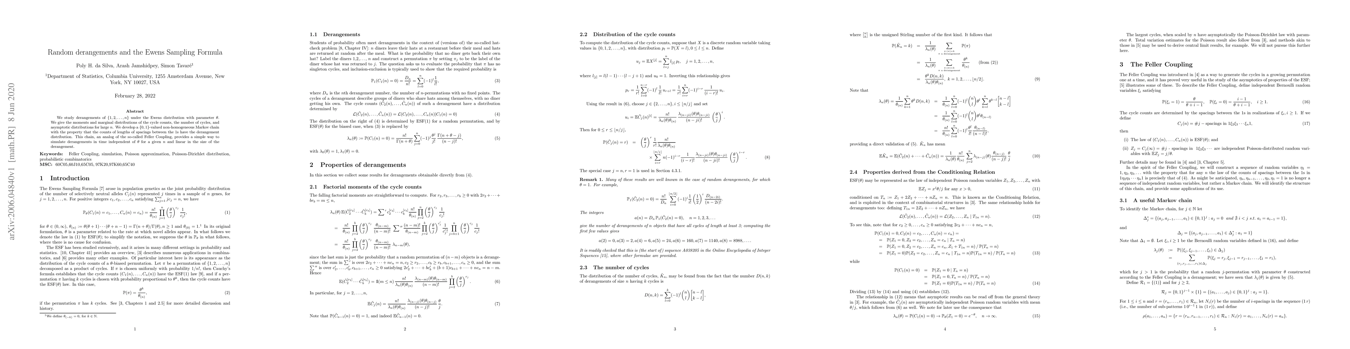 This paper studies derangements under the Ewens distribution with parameter θ, developing a method to simulate derangements using a non-homogeneous Markov chain that captures the derangement distribution.