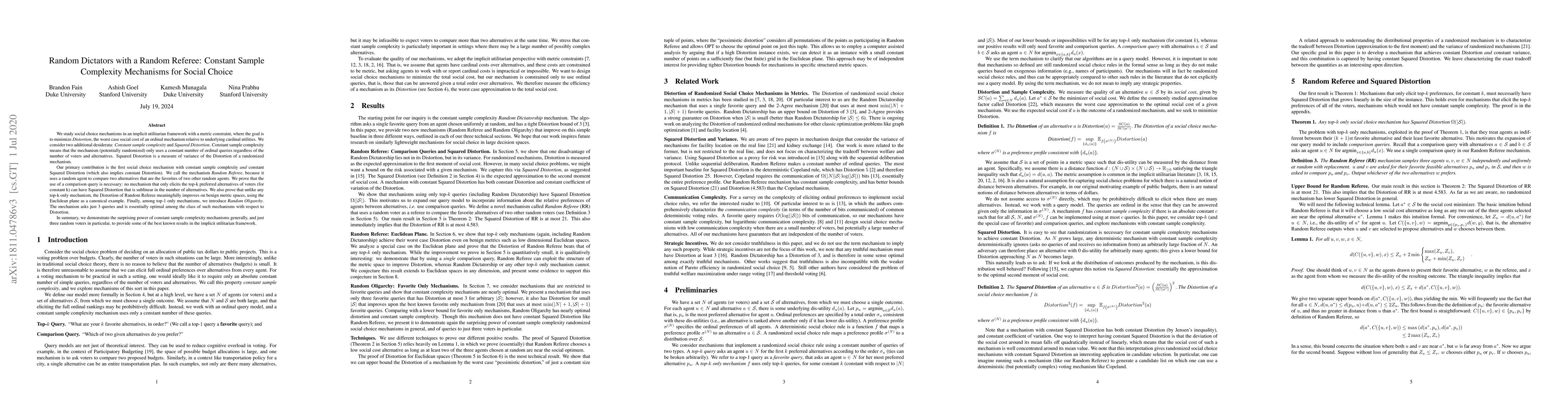 This paper introduces the Random Referee mechanism, which achieves constant sample complexity and constant Squared Distortion for social choice problems, outperforming traditional top-k mechanisms. It also presents Random Oligarchy, a top-1 mechanism requiring only three queries, demonstrating the effectiveness of minimal sample complexity in social choice.