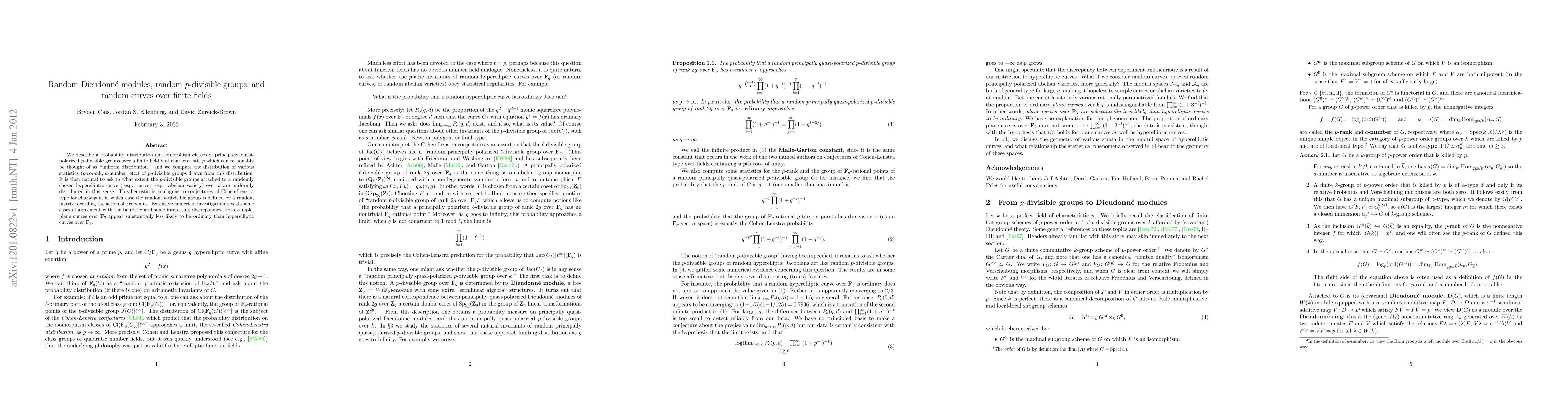 Researchers studied a probability distribution of p-divisible groups over finite fields and found some agreement with heuristics for hyperelliptic curves, but also interesting discrepancies, particularly for plane curves.