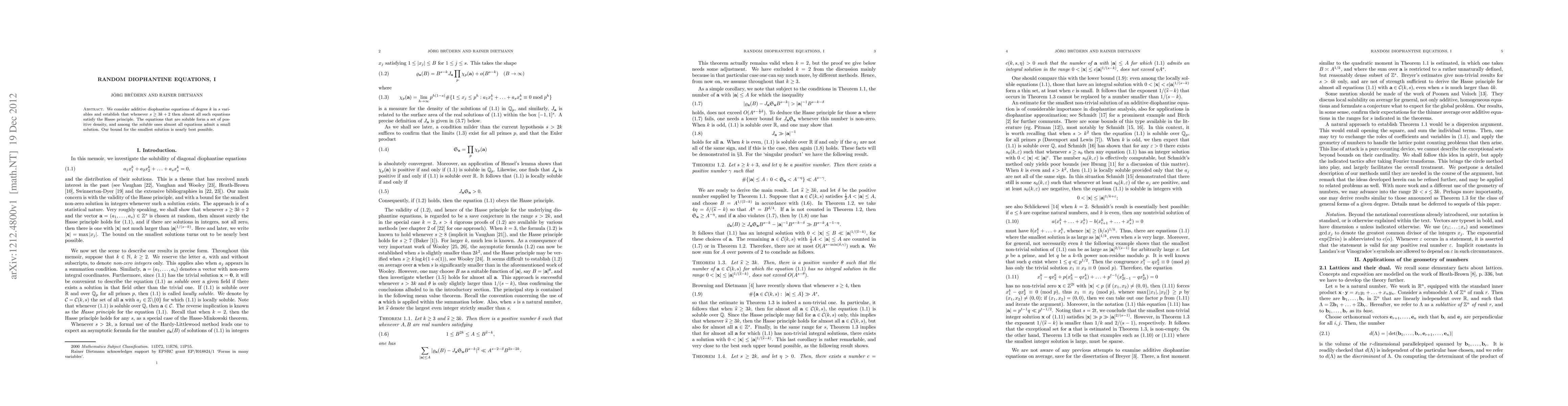This paper investigates additive Diophantine equations of degree $k$ in $s$ variables, proving that for $s \ge 3k+2$, almost all such equations satisfy the Hasse principle, with soluble equations forming a dense set and nearly all admitting small solutions.