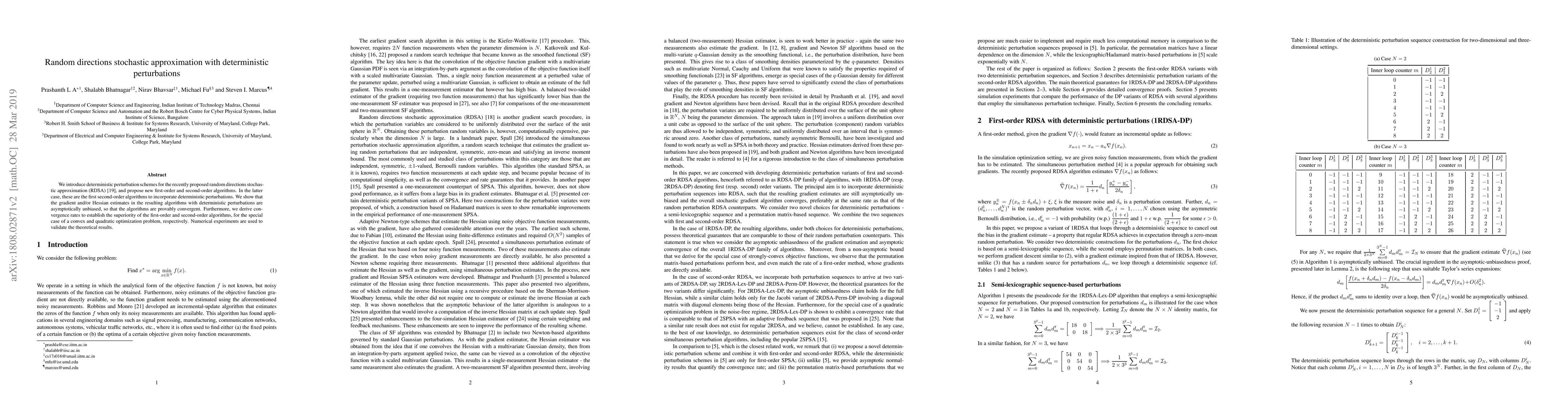 This paper introduces deterministic perturbation schemes for random directions stochastic approximation (RDSA) and proposes new first-order and second-order algorithms. The algorithms are shown to be asymptotically unbiased and convergent, with derived convergence rates demonstrating their effectiveness for convex and quadratic optimization problems, validated by numerical experiments.