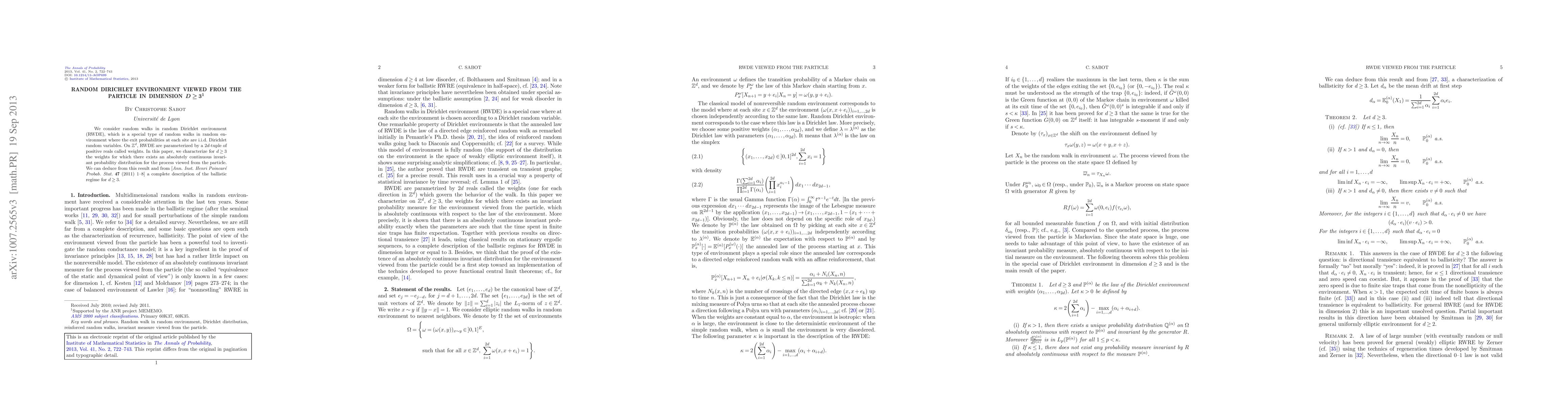 This paper studies random walks in random Dirichlet environments on ${\mathbb Z}^d$ for $d\ge 3$, focusing on the existence of an absolutely continuous invariant probability for the process viewed from the particle. It provides a complete description of the ballistic regime for these dimensions.