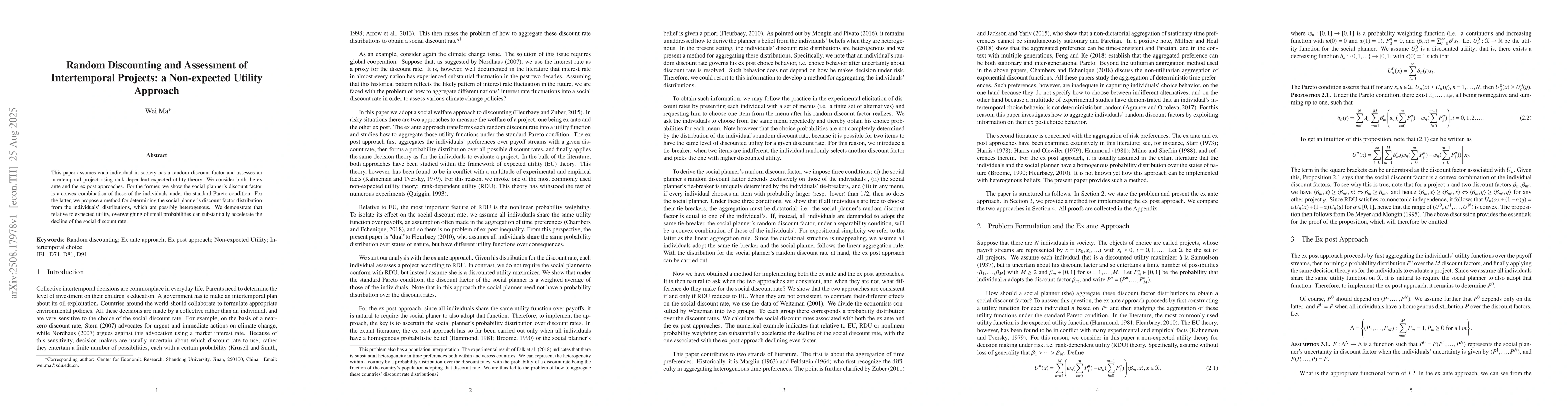 This paper assumes each individual in society has a random discount factor and assesses an intertemporal project using rank-dependent expected utility theory. We consider both the ex ante and the ex post approaches. For the former, we show the social planner's discount factor is a convex combination of those of the individuals under the standard Pareto condition. For the latter, we propose a method for determining the social planner's discount factor distribution from the individuals' distributions, which are possibly heterogenous. We demonstrate that relative to expected utility, overweighing of small probabilities can substantially accelerate the decline of the social discount rate.