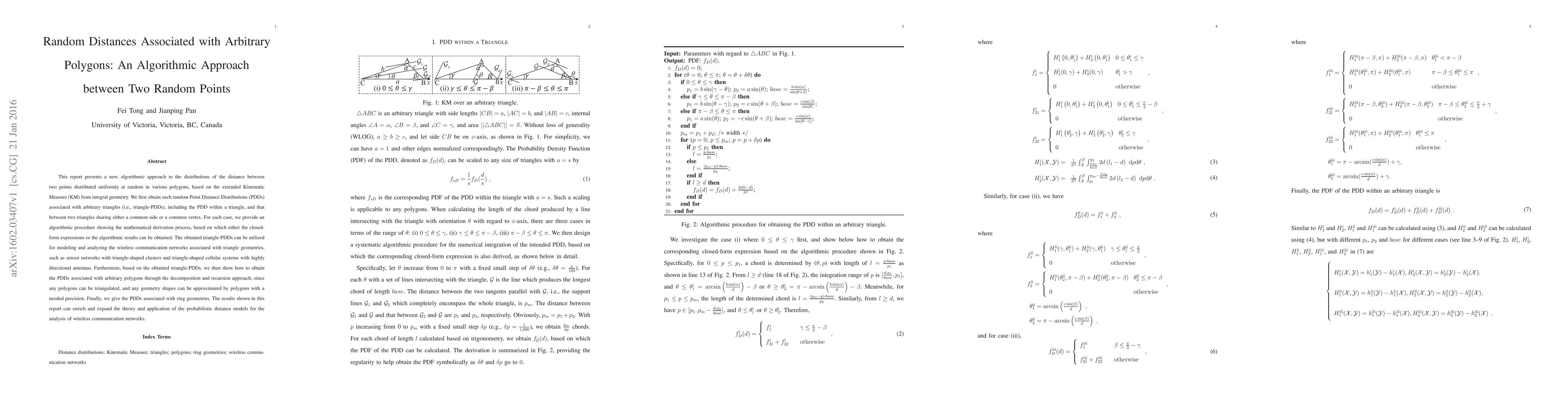This report presents a new, algorithmic approach to the distributions of the distance between two points distributed uniformly at random in various polygons, based on the extended Kinematic Measure (KM) from integral geometry. We first obtain such random Point Distance Distributions (PDDs) associated with arbitrary triangles (i.e., triangle-PDDs), including the PDD within a triangle, and that between two triangles sharing either a common side or a common vertex. For each case, we provide an algorithmic procedure showing the mathematical derivation process, based on which either the closed-form expressions or the algorithmic results can be obtained. The obtained triangle-PDDs can be utilized for modeling and analyzing the wireless communication networks associated with triangle geometries, such as sensor networks with triangle-shaped clusters and triangle-shaped cellular systems with highly directional antennas. Furthermore, based on the obtained triangle-PDDs, we then show how to obtain the PDDs associated with arbitrary polygons through the decomposition and recursion approach, since any polygons can be triangulated, and any geometry shapes can be approximated by polygons with a needed precision. Finally, we give the PDDs associated with ring geometries. The results shown in this report can enrich and expand the theory and application of the probabilistic distance models for the analysis of wireless communication networks.
