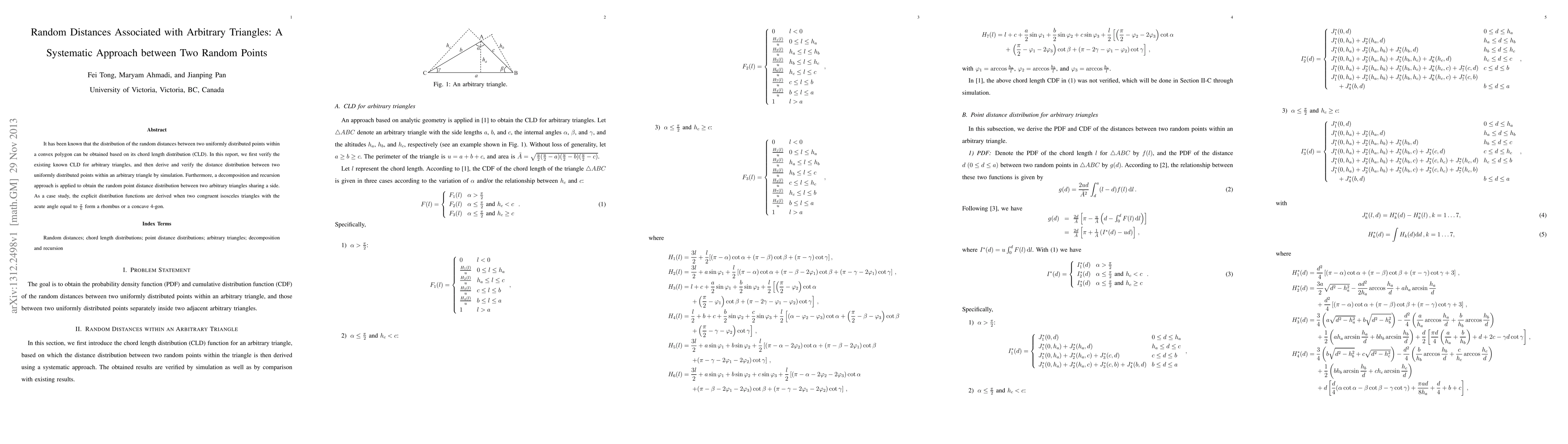 This paper verifies the chord length distribution for arbitrary triangles and derives the distance distribution between two uniformly distributed points within such triangles via simulation. It also introduces a decomposition and recursion method to determine the distance distribution between two arbitrary triangles sharing a side, with a case study on congruent isosceles triangles forming a rhombus or concave quadrilateral.
