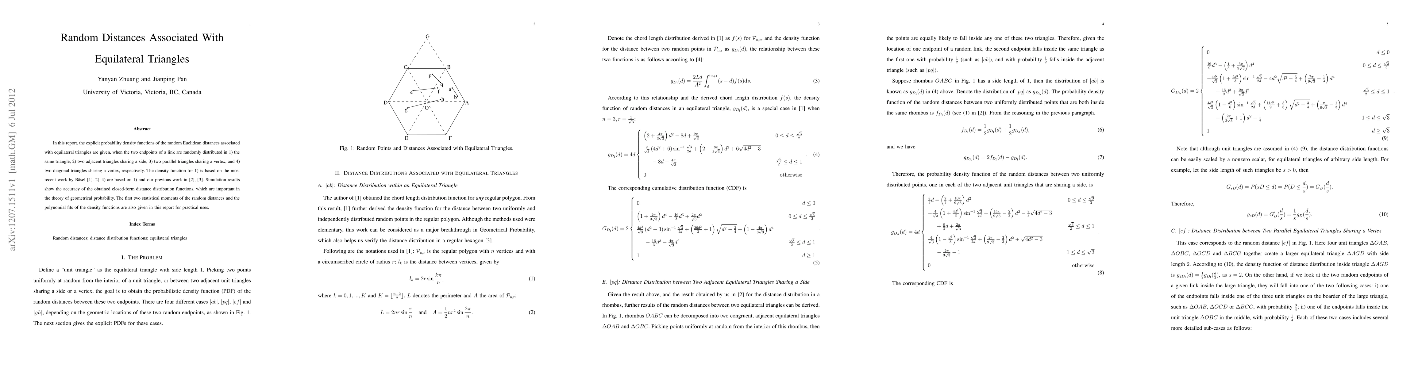 In this report, the explicit probability density functions of the random Euclidean distances associated with equilateral triangles are given, when the two endpoints of a link are randomly distributed in 1) the same triangle, 2) two adjacent triangles sharing a side, 3) two parallel triangles sharing a vertex, and 4) two diagonal triangles sharing a vertex, respectively. The density function for 1) is based on the most recent work by Basel [1]. 2)-4) are based on 1) and our previous work in [2], [3]. Simulation results show the accuracy of the obtained closed-form distance distribution functions, which are important in the theory of geometrical probability. The first two statistical moments of the random distances and the polynomial fits of the density functions are also given in this report for practical uses.