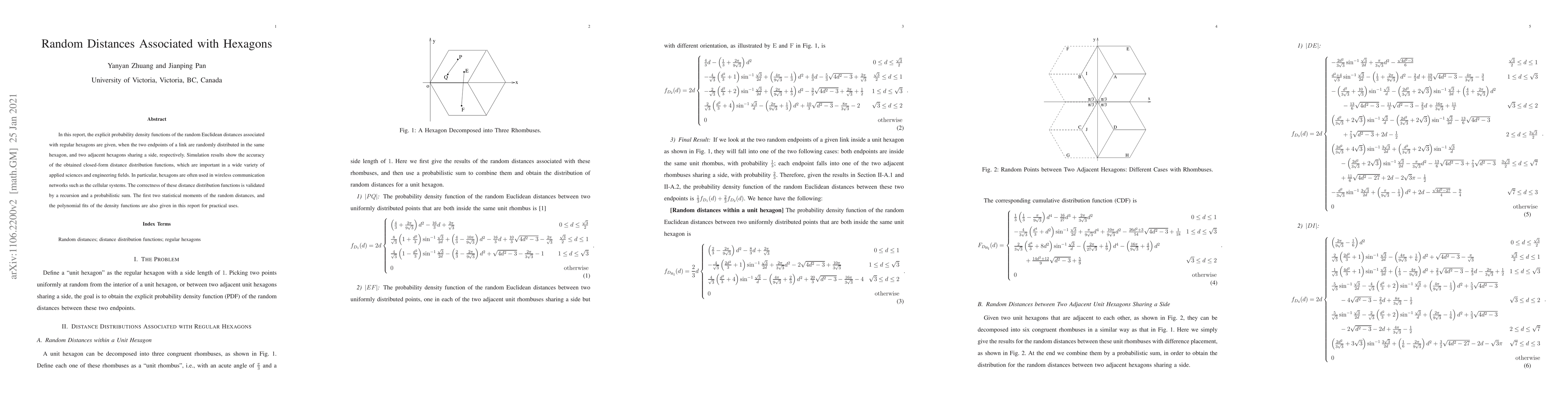 In this report, the explicit probability density functions of the random Euclidean distances associated with regular hexagons are given, when the two endpoints of a link are randomly distributed in the same hexagon, and two adjacent hexagons sharing a side, respectively. Simulation results show the accuracy of the obtained closed-form distance distribution functions, which are important in a wide variety of applied sciences and engineering fields. In particular, hexagons are often used in wireless communication networks such as the cellular systems. The correctness of these distance distribution functions is validated by a recursion and a probabilistic sum. The first two statistical moments of the random distances, and the polynomial fits of the density functions are also given in this report for practical uses.