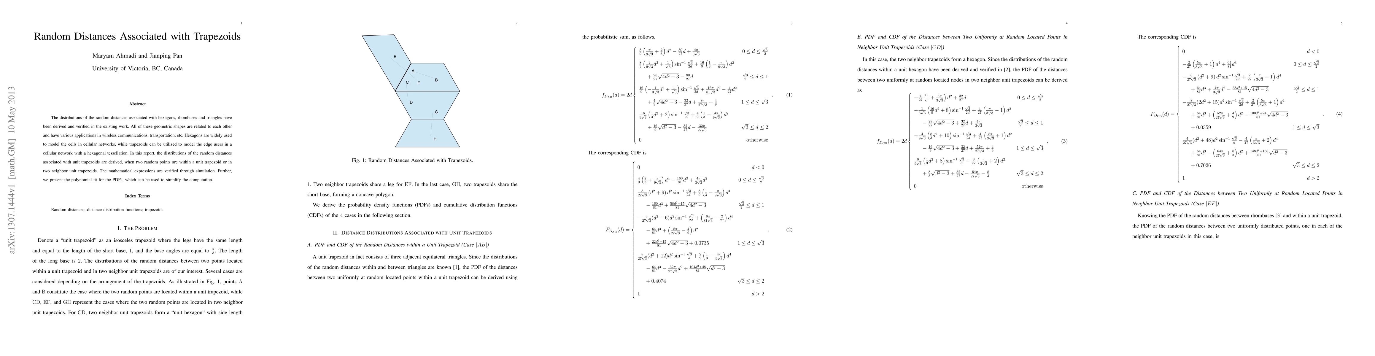 The distributions of the random distances associated with hexagons, rhombuses and triangles have been derived and verified in the existing work. All of these geometric shapes are related to each other and have various applications in wireless communications, transportation, etc. Hexagons are widely used to model the cells in cellular networks, while trapezoids can be utilized to model the edge users in a cellular network with a hexagonal tessellation. In this report, the distributions of the random distances associated with unit trapezoids are derived, when two random points are within a unit trapezoid or in two neighbor unit trapezoids. The mathematical expressions are verified through simulation. Further, we present the polynomial fit for the PDFs, which can be used to simplify the computation.