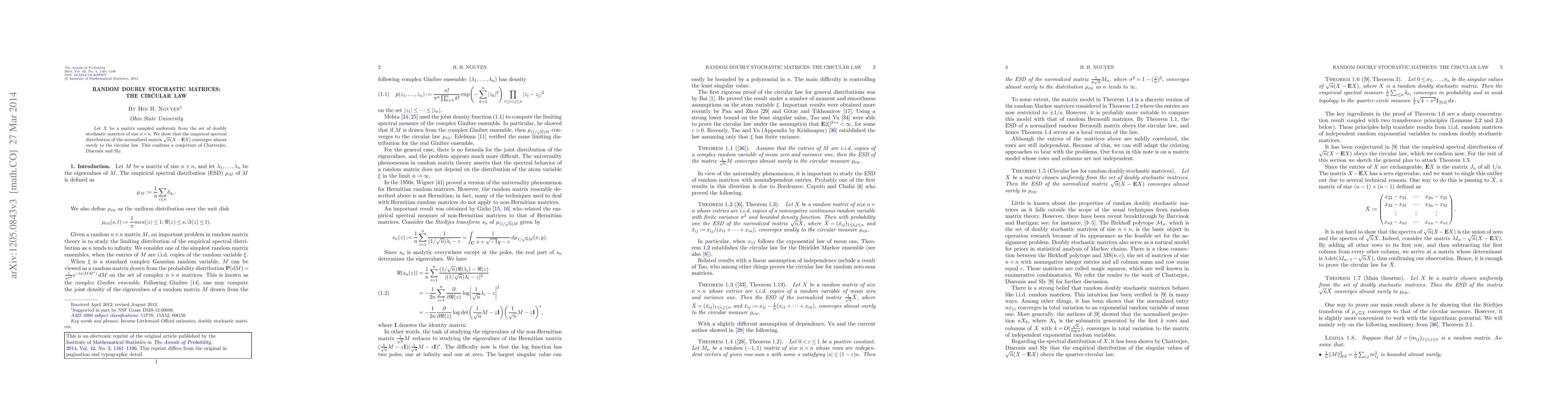 This research paper proves that the spectral distribution of a randomly chosen doubly stochastic matrix, when normalized and of size n x n, converges almost surely to the circular law. It confirms a conjecture proposed by Chatterjee, Diaconis, and Sly.