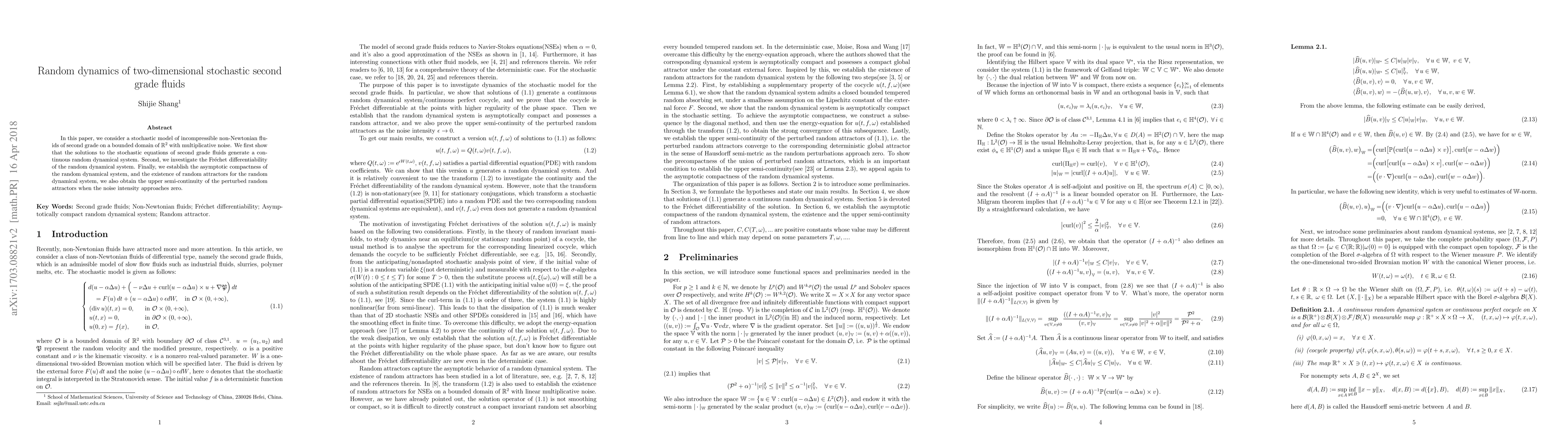 This paper studies the stochastic dynamics of incompressible second grade fluids in two dimensions, demonstrating the generation of a continuous random dynamical system and proving the Fréchet differentiability, asymptotic compactness, and existence of random attractors, with upper semi-continuity as the noise intensity diminishes.