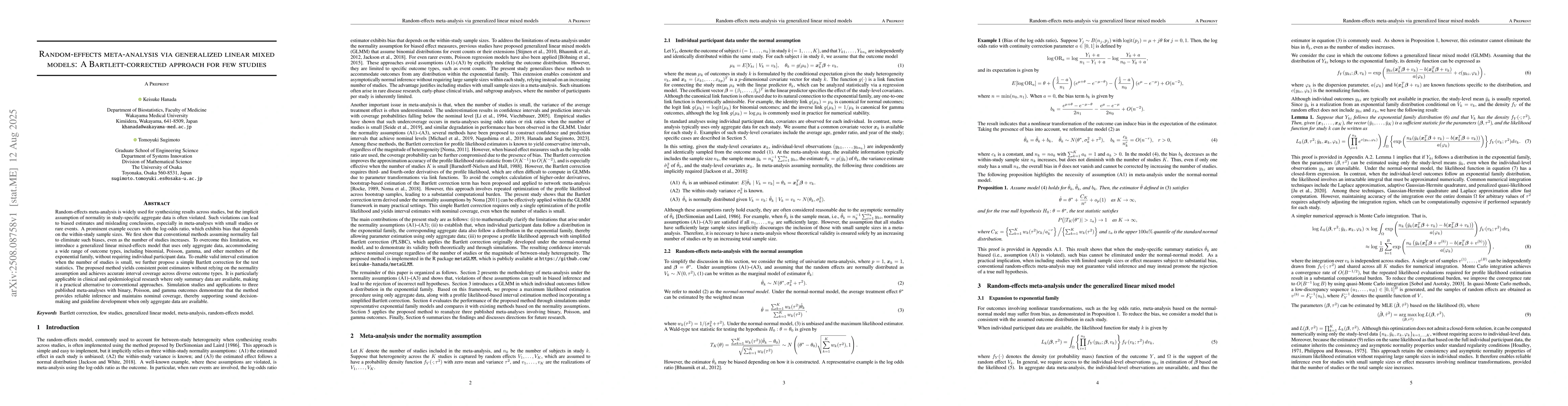 Random-effects meta-analysis is widely used for synthesizing results across studies, but the implicit assumption of normality in study-specific aggregate data is often violated. Such violations can lead to biased estimates and misleading conclusions, especially in meta-analyses with small studies or rare events. A prominent example occurs with the log-odds ratio, which exhibits bias that depends on the within-study sample sizes. We first show that conventional methods assuming normality fail to eliminate such biases, even as the number of studies increases. To overcome this limitation, we introduce a generalized linear mixed-effects model that uses only aggregate data, accommodating a wide range of outcome types, including binomial, Poisson, gamma, and other members of the exponential family, without requiring individual participant data. To enable valid interval estimation when the number of studies is small, we further propose a simple Bartlett correction for the test statistics. The proposed method yields consistent point estimators without relying on the normality assumption and achieves accurate interval coverage across diverse outcome types. It is particularly applicable in clinical and epidemiological research where only summary data are available, making it a practical alternative to conventional approaches. Simulation studies and applications to three published meta-analyses with binary, Poisson, and gamma outcomes demonstrate that the method provides reliable inference and maintains nominal coverage, thereby supporting sound decision-making and guideline development when only aggregate data are available.